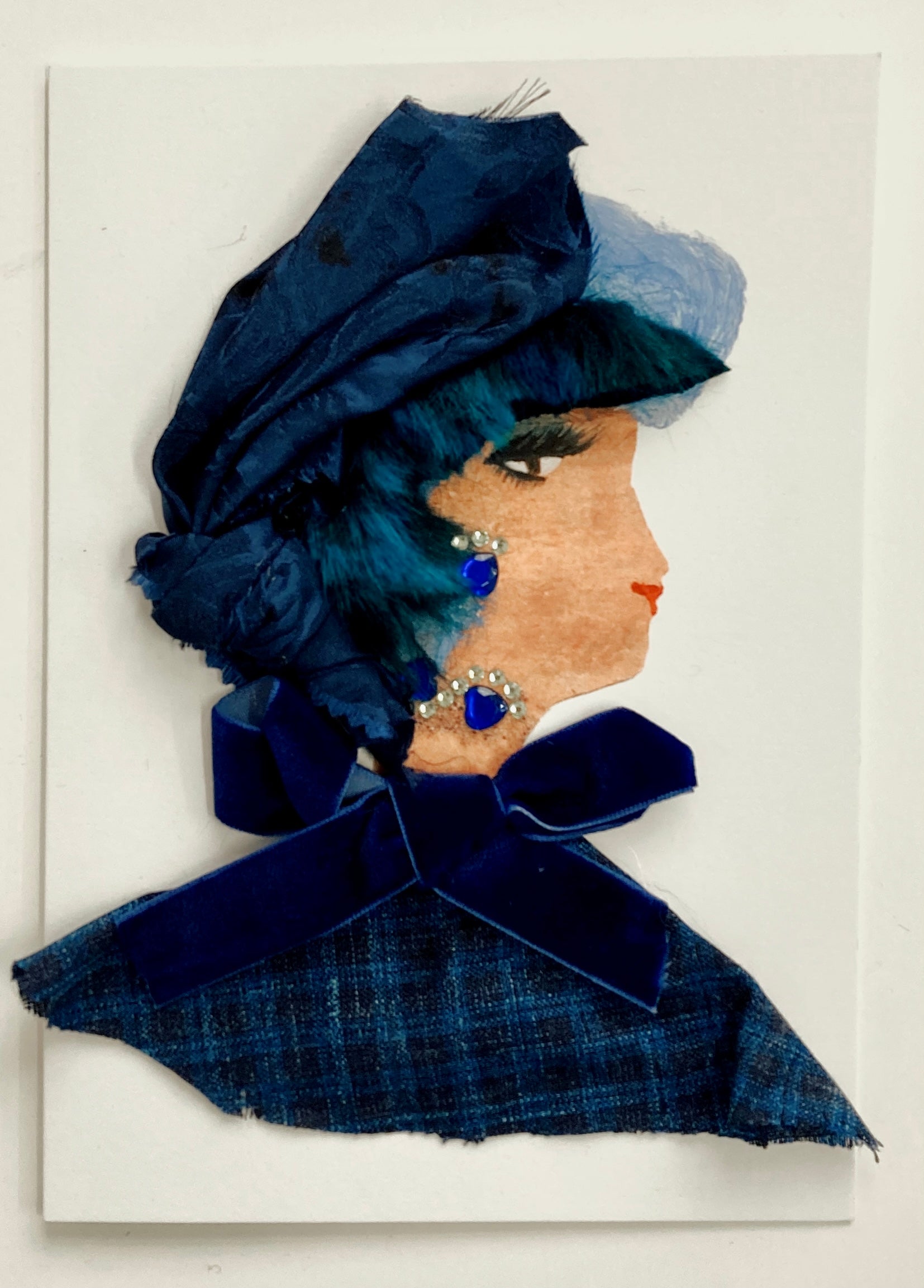 Aquamarine Alperton is dressed completely in a striking deep turquoise colour from her dress to her hat to her hair. She has a lush dark blue bow around her neck and royal blue jewellery.