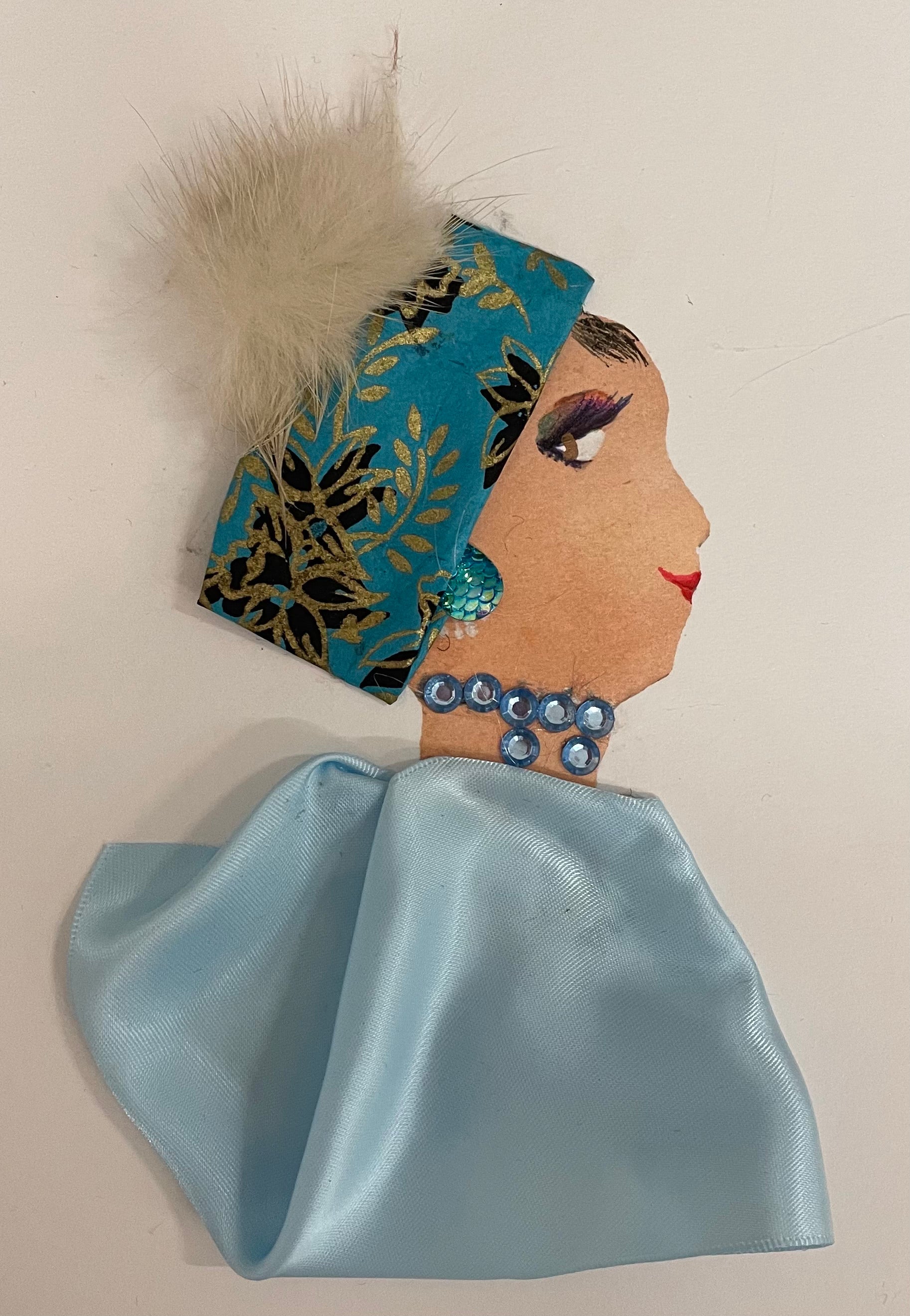 Doctor Hampstead Blue has a printed headband round her hair. she wearing a baby blue blouse with blue matching jewellery.