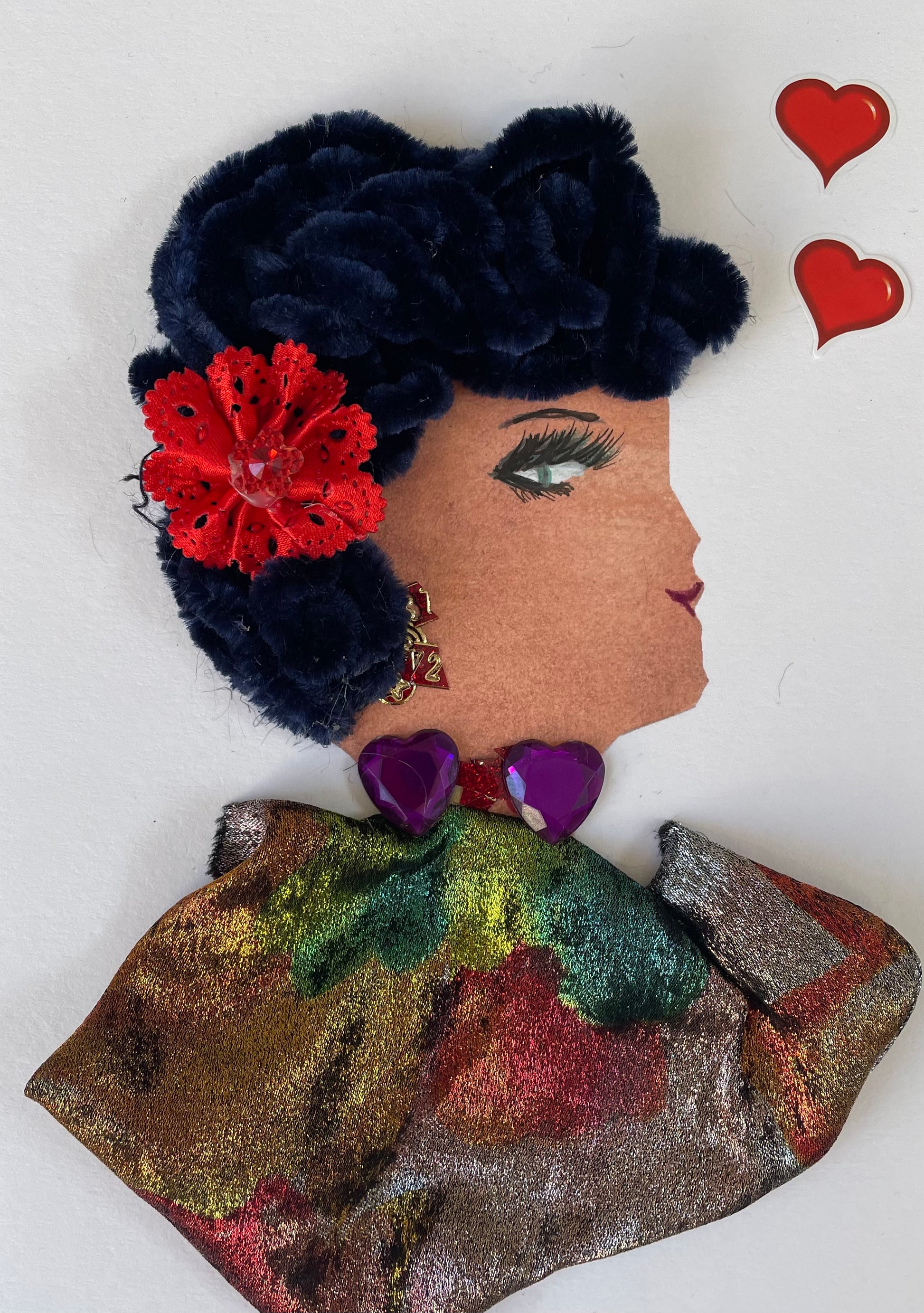 Doctor Copper County is wearing a multi colored blouse with 2 purple jewels for her necklace. She has a red flower in her hair with 2 red hearts to the right of her.