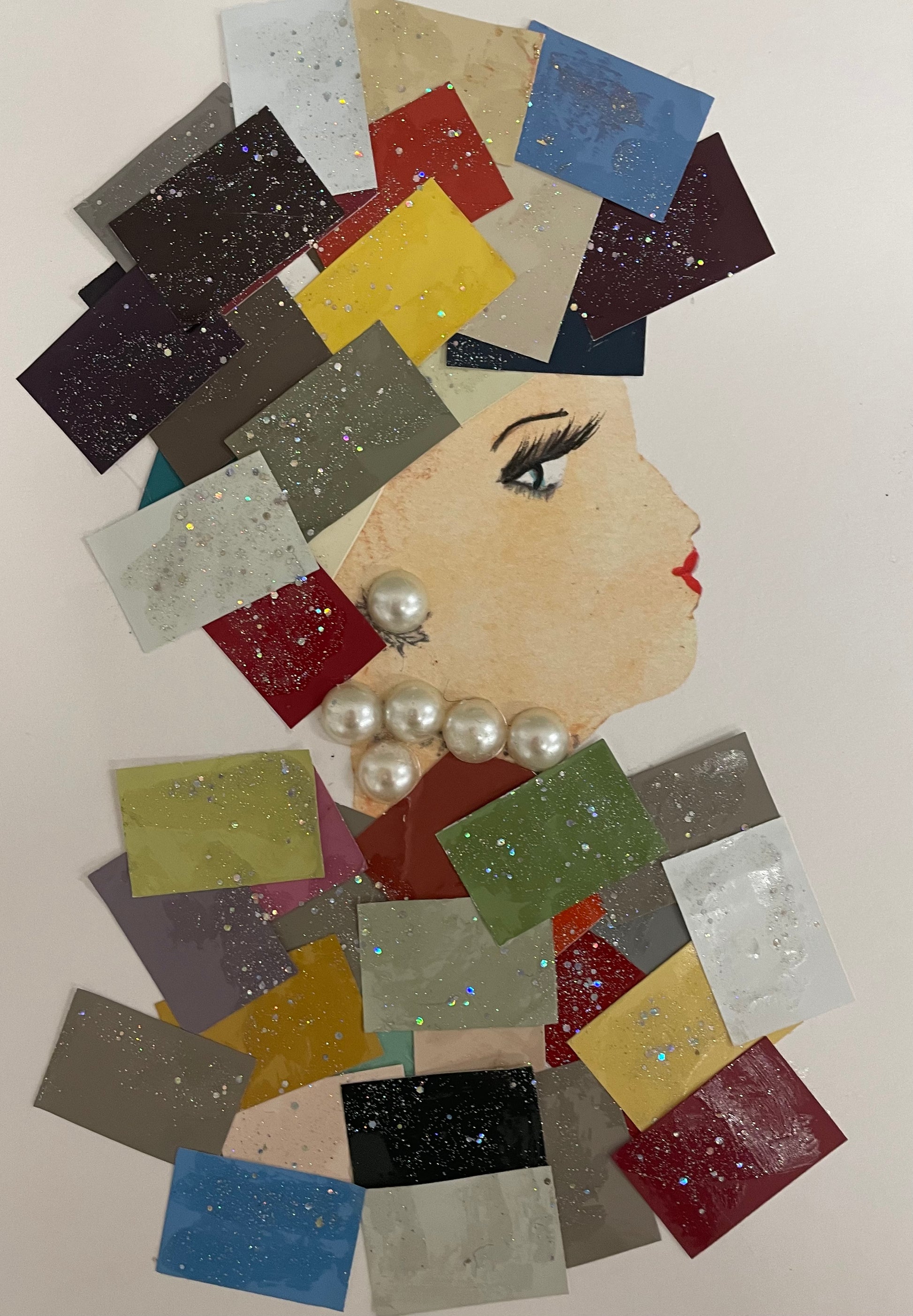 I have called this card Analytical Arsenal .She is designed wearing a multi coloured geometric blouse with a matching headpiece. She has matching pearl earrings and necklace.