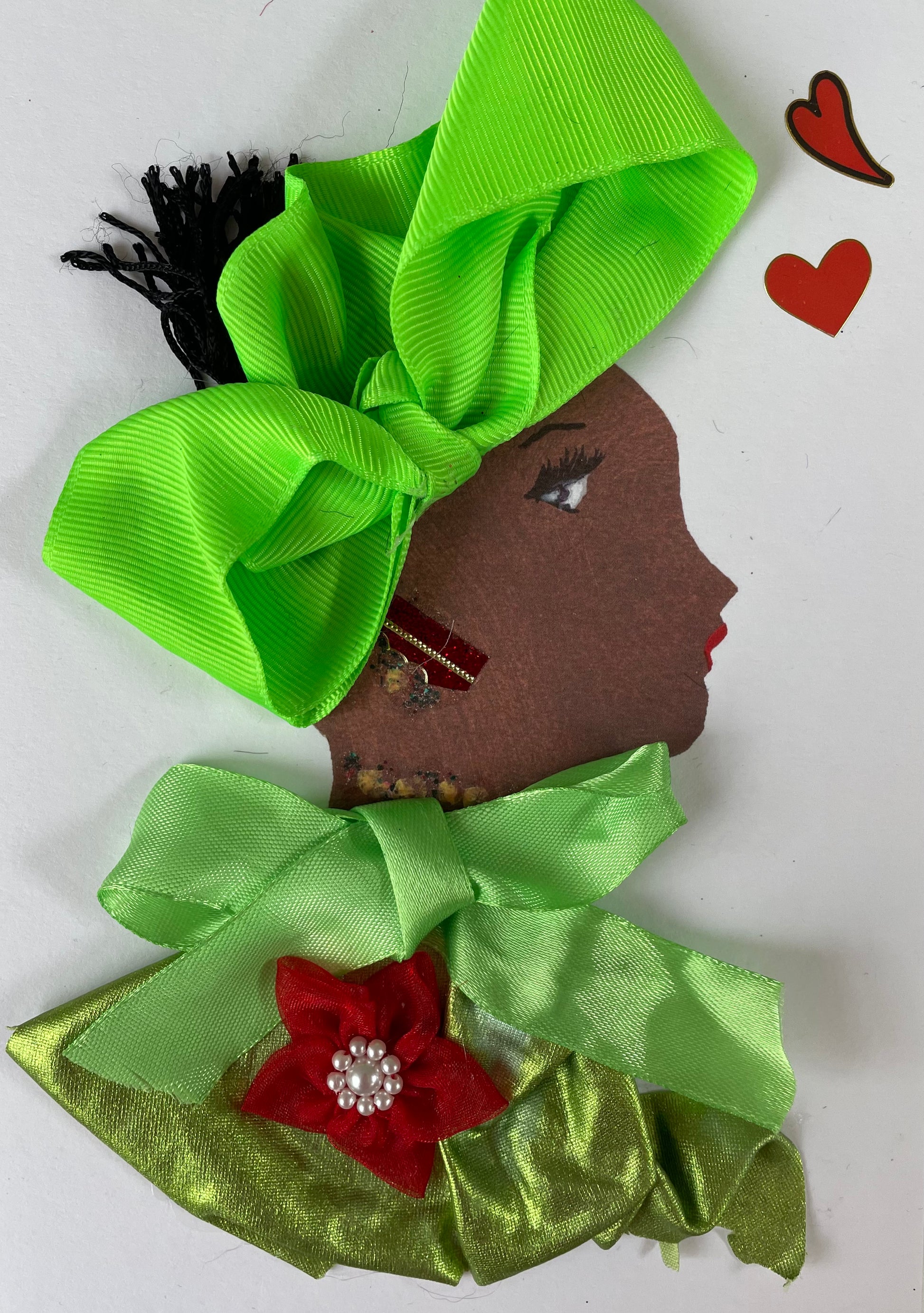 Doctor Luscious Lime is wearing a shiny moss coloured blouse with a kiwi green bow. There is a red poinsettia flower on top. She has a big lime green bow in her hair. Luscious Lime is wearing gold jewellery to compliment her outfit. There are 2 red hearts to the right of her.
