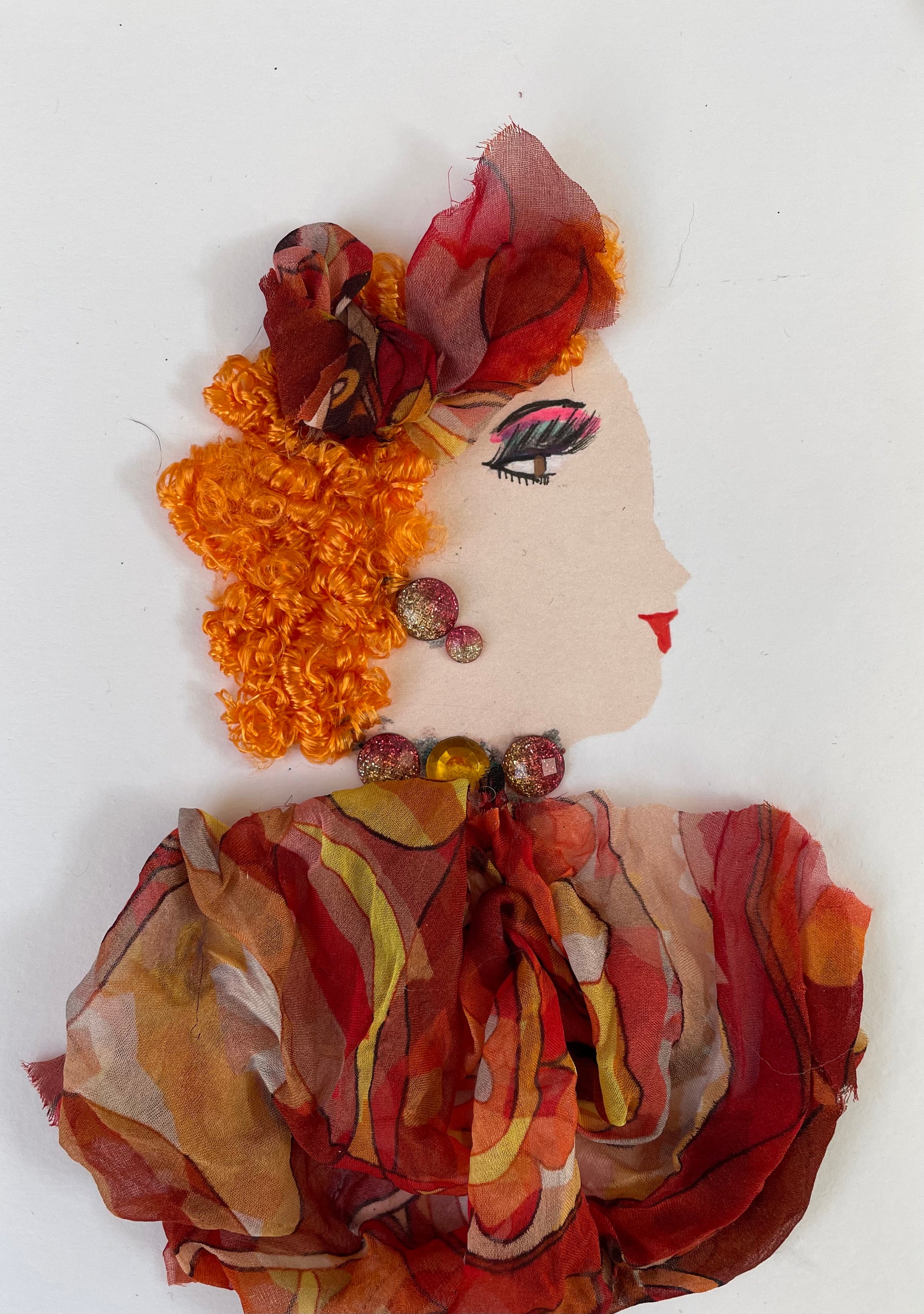Doctor Dagenham Donna is wearing a warm toned blouse with red, orange and yellow colours. Her bright orange hair is complimented with a whimsical dark red bow that sits on top.
