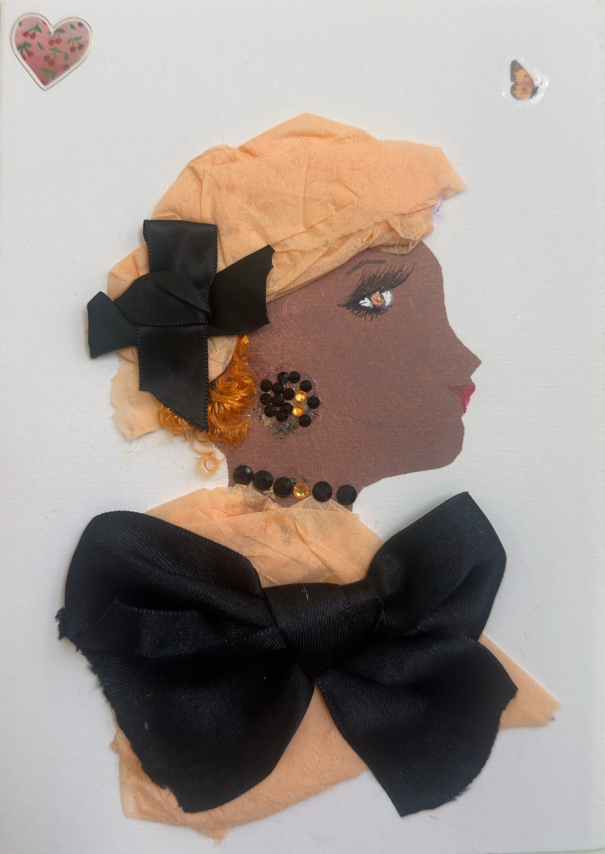 I made this handmade card of a woman named Barbican Betty. Her peach wrap and large black satin bows make a dramatic, stylish contrast, while a small cluster of black and orange beads at her collar adds intricate charm. The peach and black balance gives her look a timeless elegance.