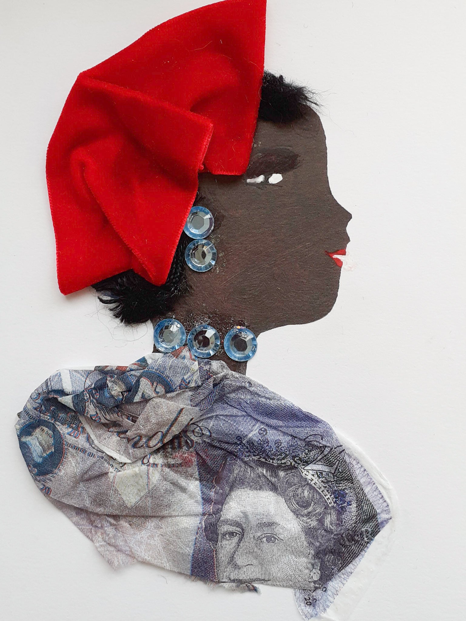 Nollywood Nadia is wearing a money-printed top and has a matching light blue necklace and earrings with her red velvet hat for softness.