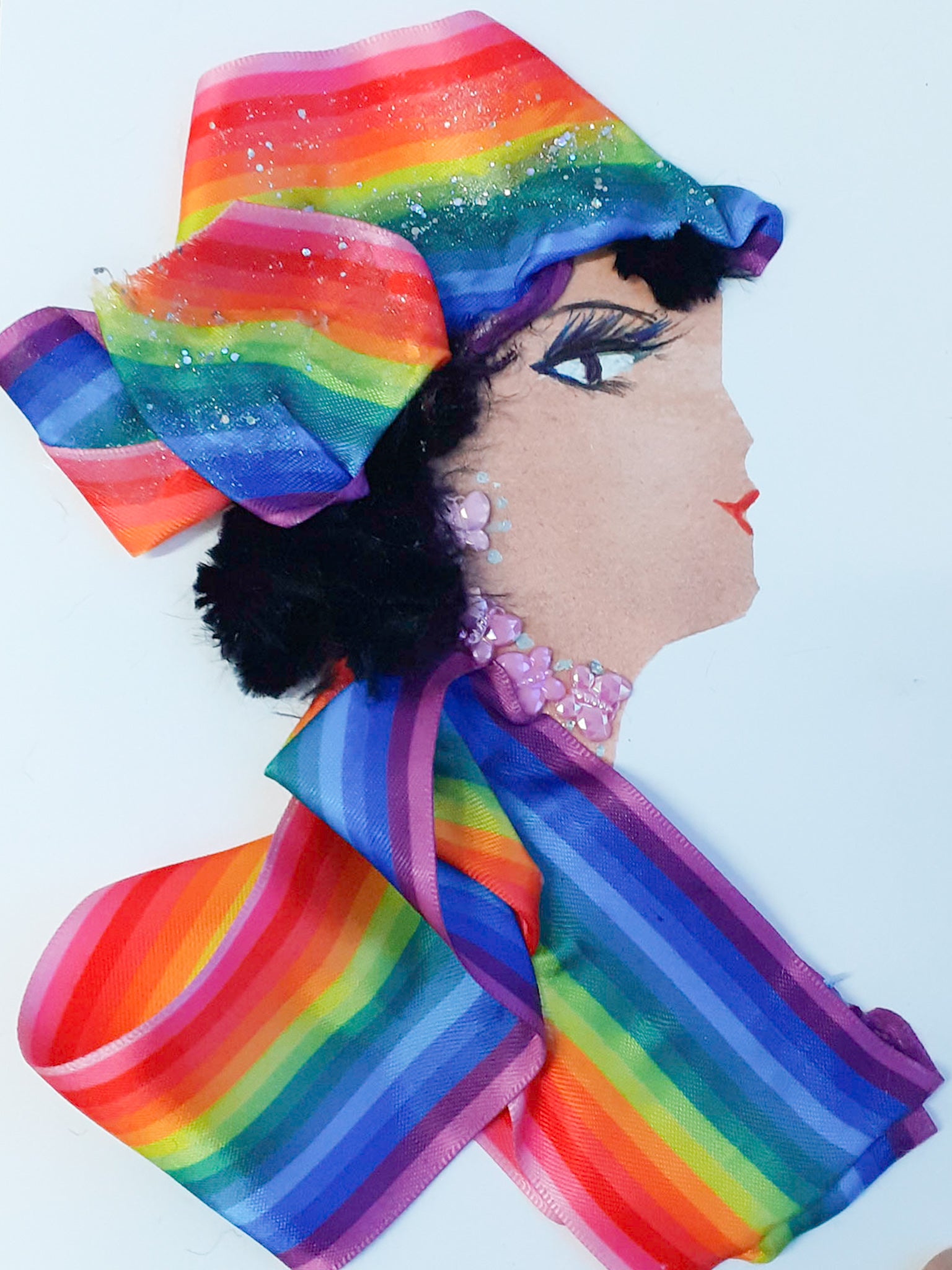 Doctor NHS is wearing a rainbow colour dress and sparking pink necklace with her black fluffy hair.