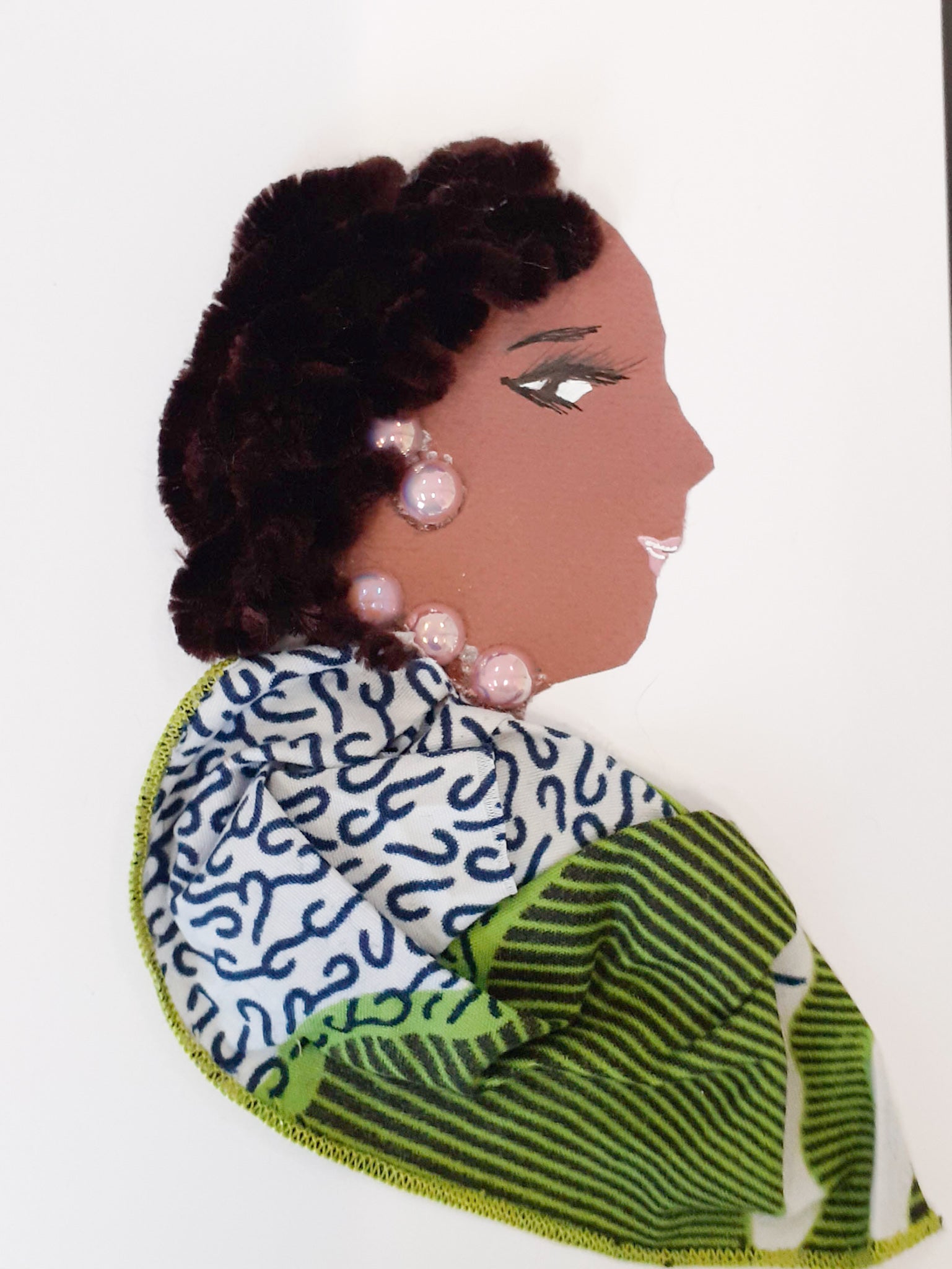 Skegness Suzy is wearing a colour patterned dress (green and white with navy patterns). Her jewellery is pink to match her pink lips.