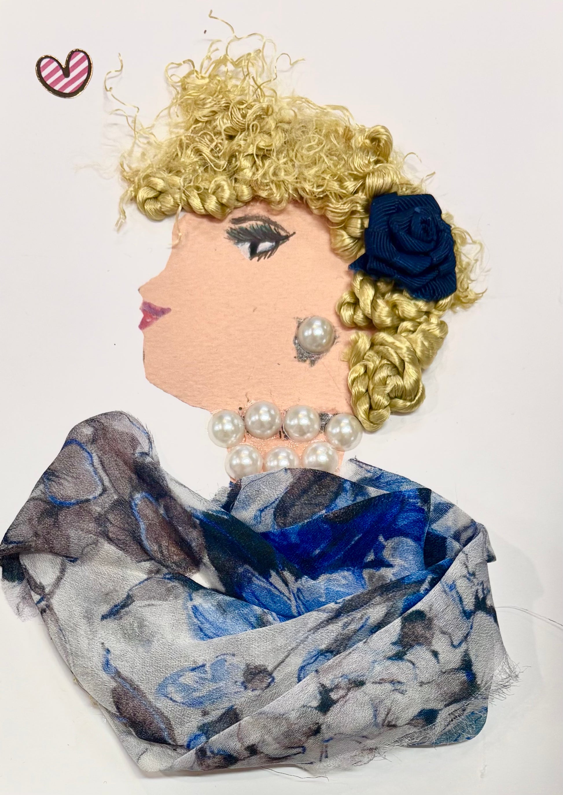 This amazing card was delightfully handmade. Amazing Amelia wears a navy blue flower in her hair and a multicoloured blue blouse. Her pearl jewellery bring her whole outfit together. The heart in the top right is a reminder to give this card to someone you love!