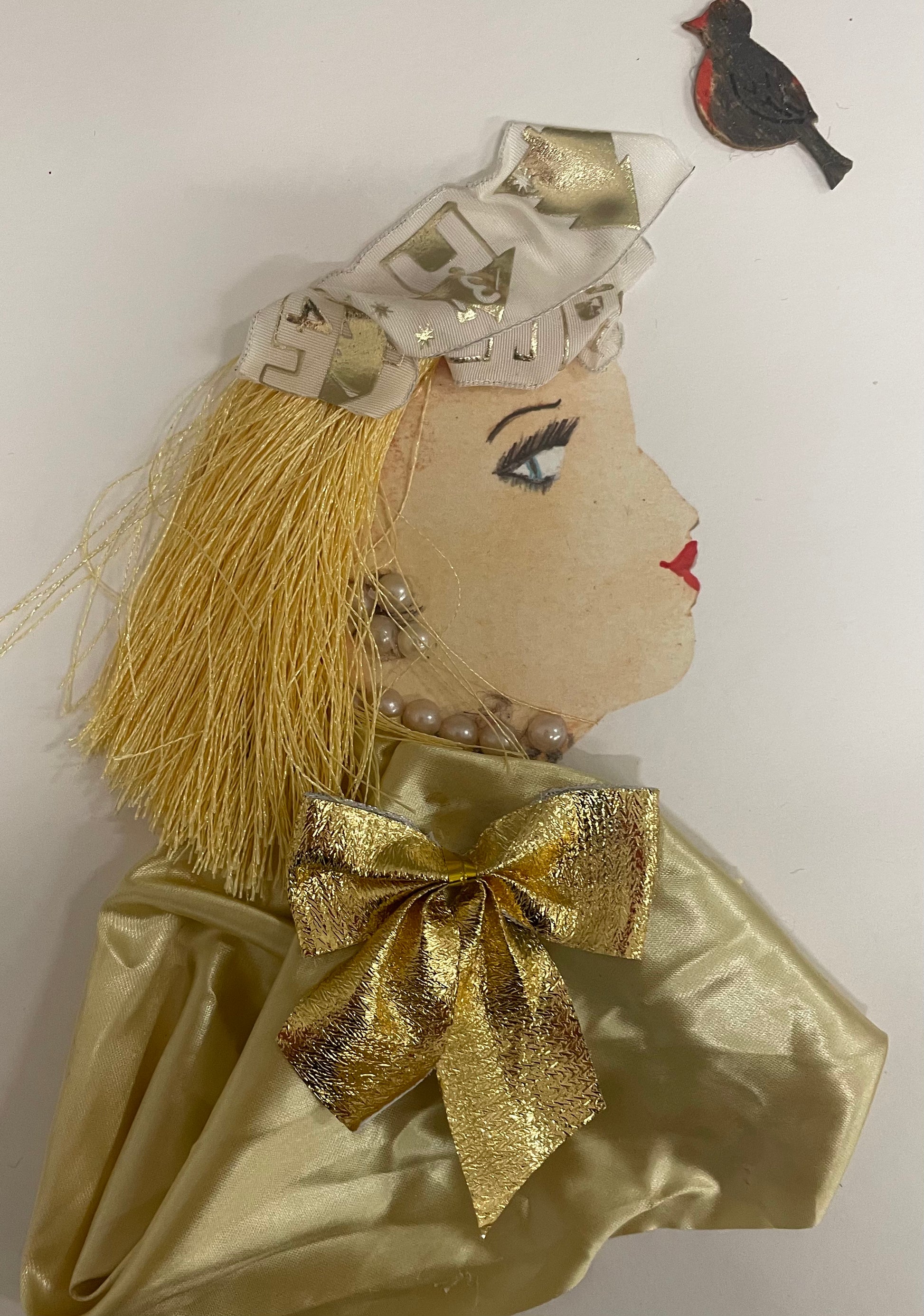 Elizabeth is wearing a gold blouse with a darker gold bow. She has a matching set of beige beaded jewellery. She has a white and gold headpiece in her hair. There is a bird to the top right corner of her.