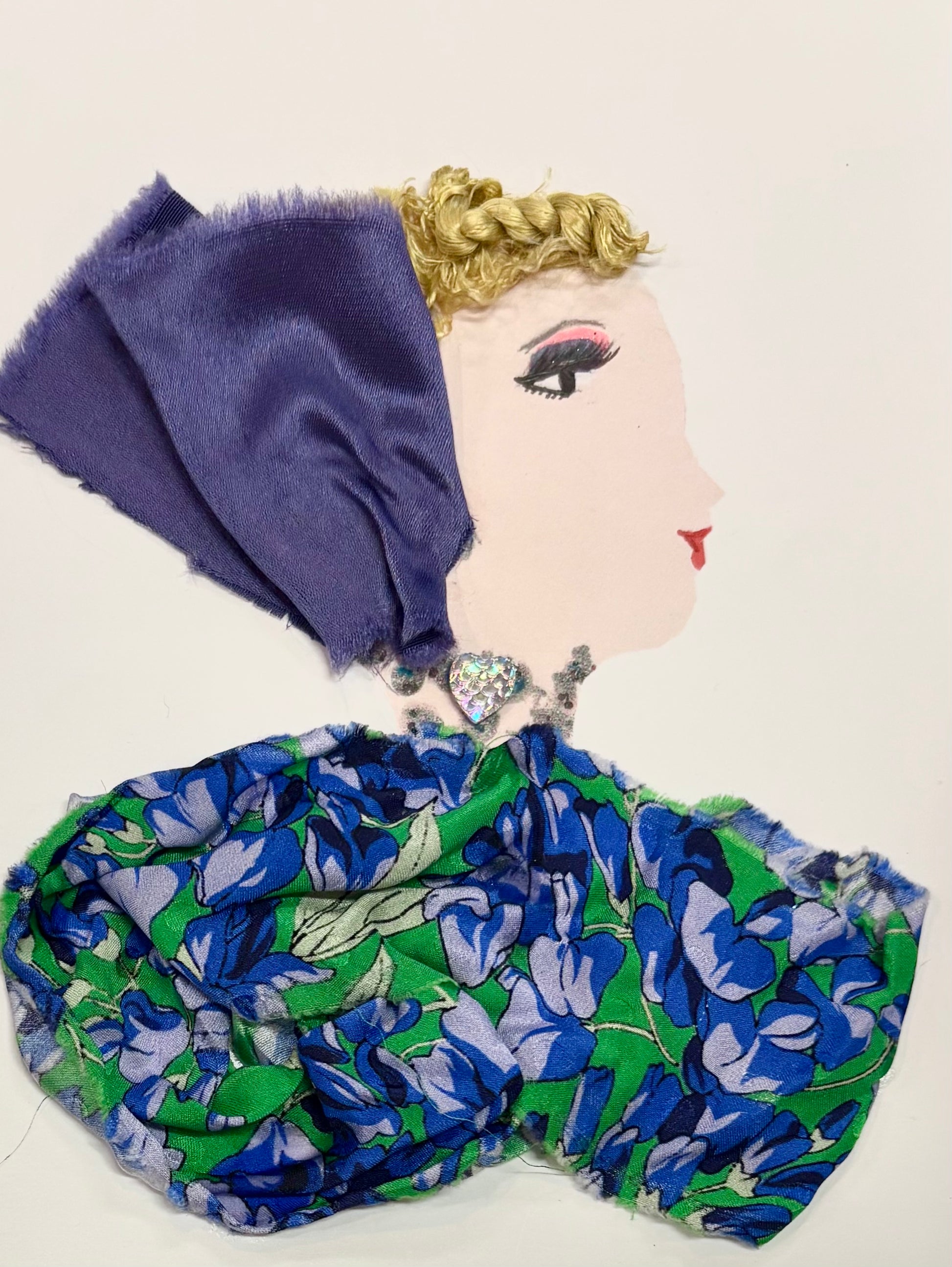 This one of a kind card was delightfully handmade. The woman features wears a purple bonnet and a multicoloured, cool toned blouse. Her necklace adds some shimmer to her fashionable look.