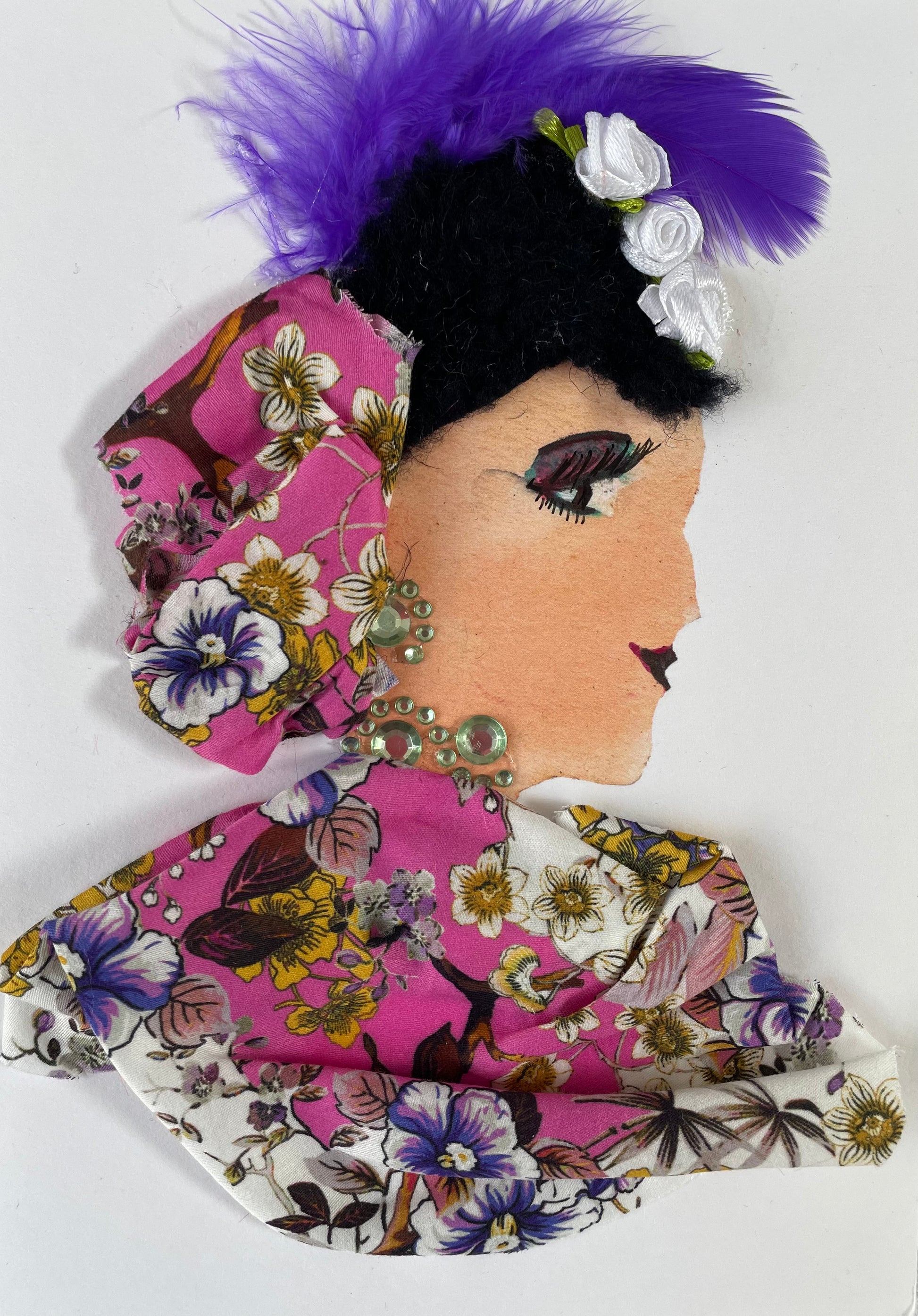 Francesca Fulham is wearing a printed, floral blouse consisting of pink, yellow, white and purple. She is wearing a diamanté necklace and earrings. Her headpiece matches her blouse. There is a purple feather to accompany her hair and headpiece with 3 white flowers.