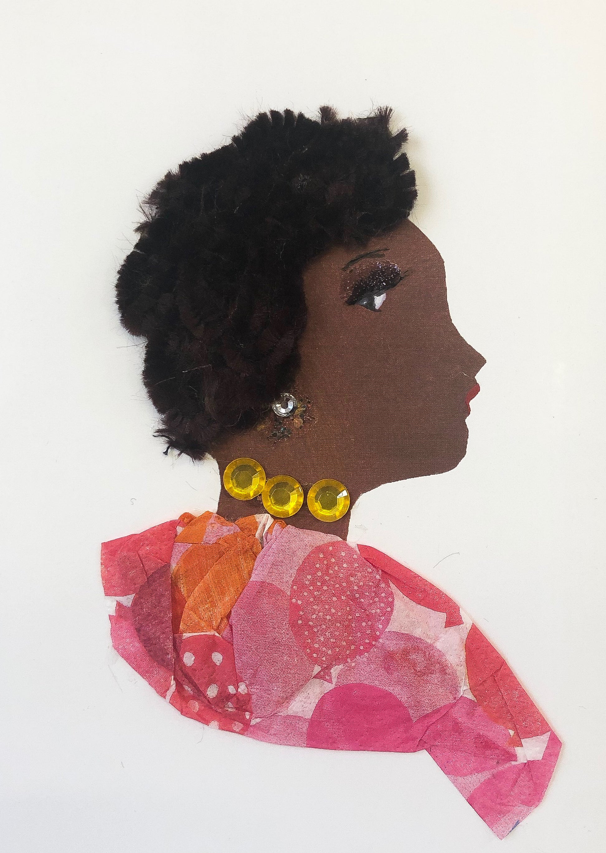 Femi Farringdon is wearing a mix of colours including pink, white, and orange on her blouse alongside her jewelry.