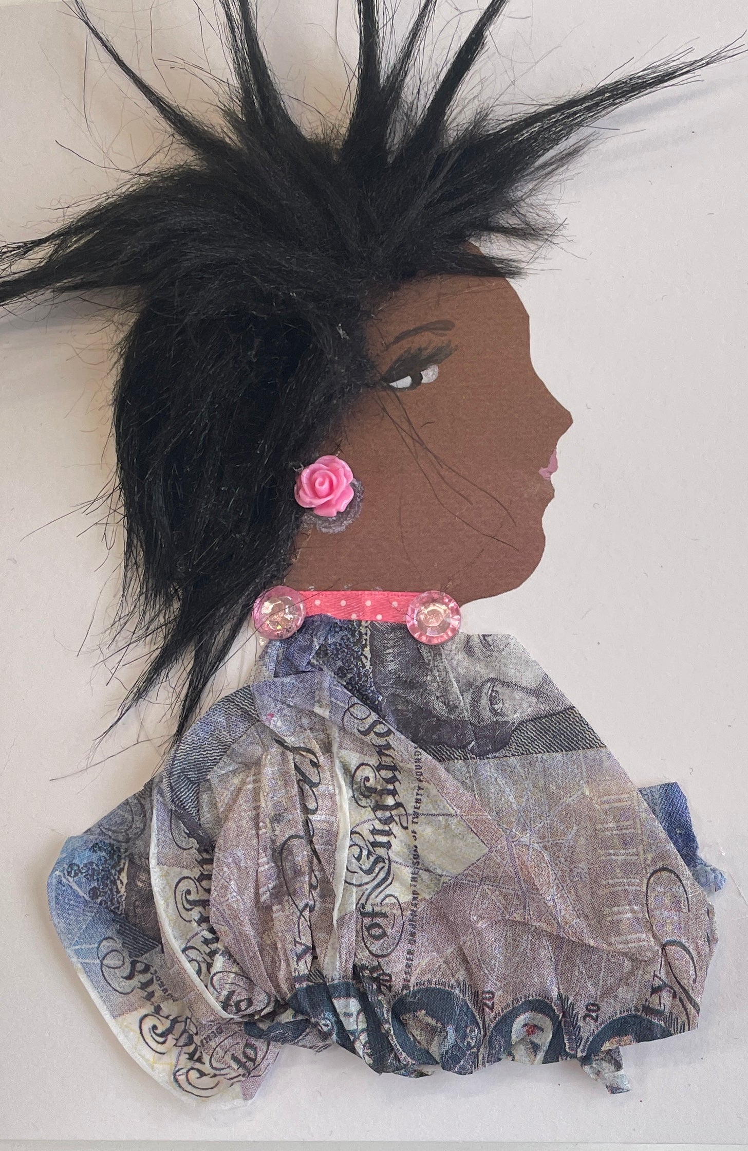 I designed this card of a woman who is wearing a beautiful blue money print blouse. She wears stunning pink rose earrings and a pink necklace. This card is perfect for any special occasion, with exquisite details that make it stand out from the rest. The vibrant colors make it a delightful addition to any collection.