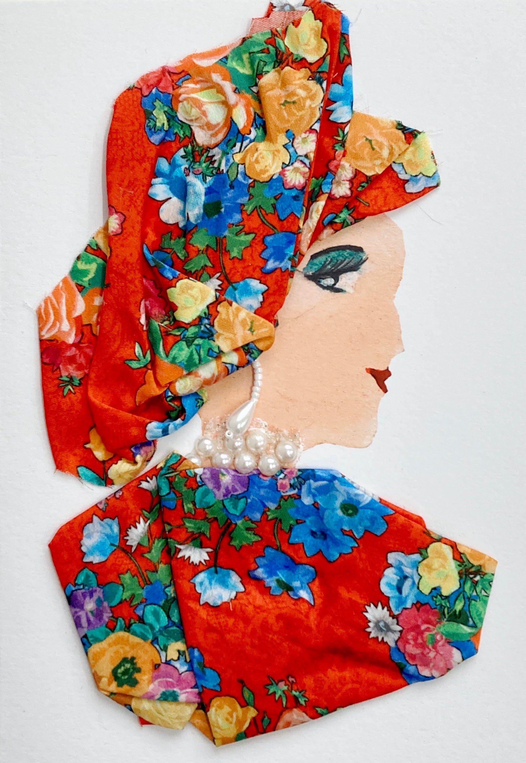 Genevieve Greenford is wearing a lovely red Italian printed blouse and head wrap. She is wearing beautiful pearl jewellery. She has a microphone attached to her ear.