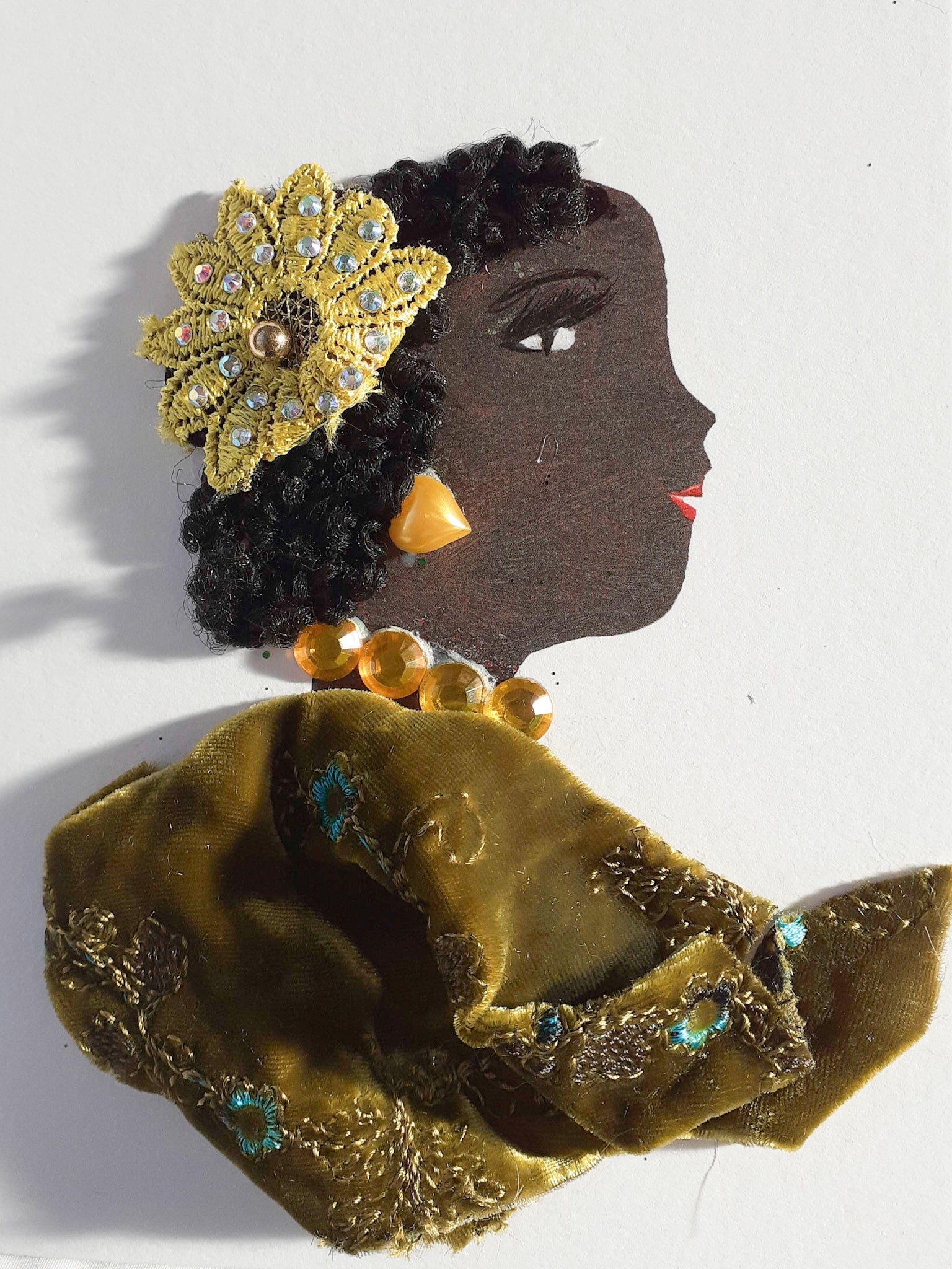 Golden is wearing a gold dress and a flower on her black curly hair.