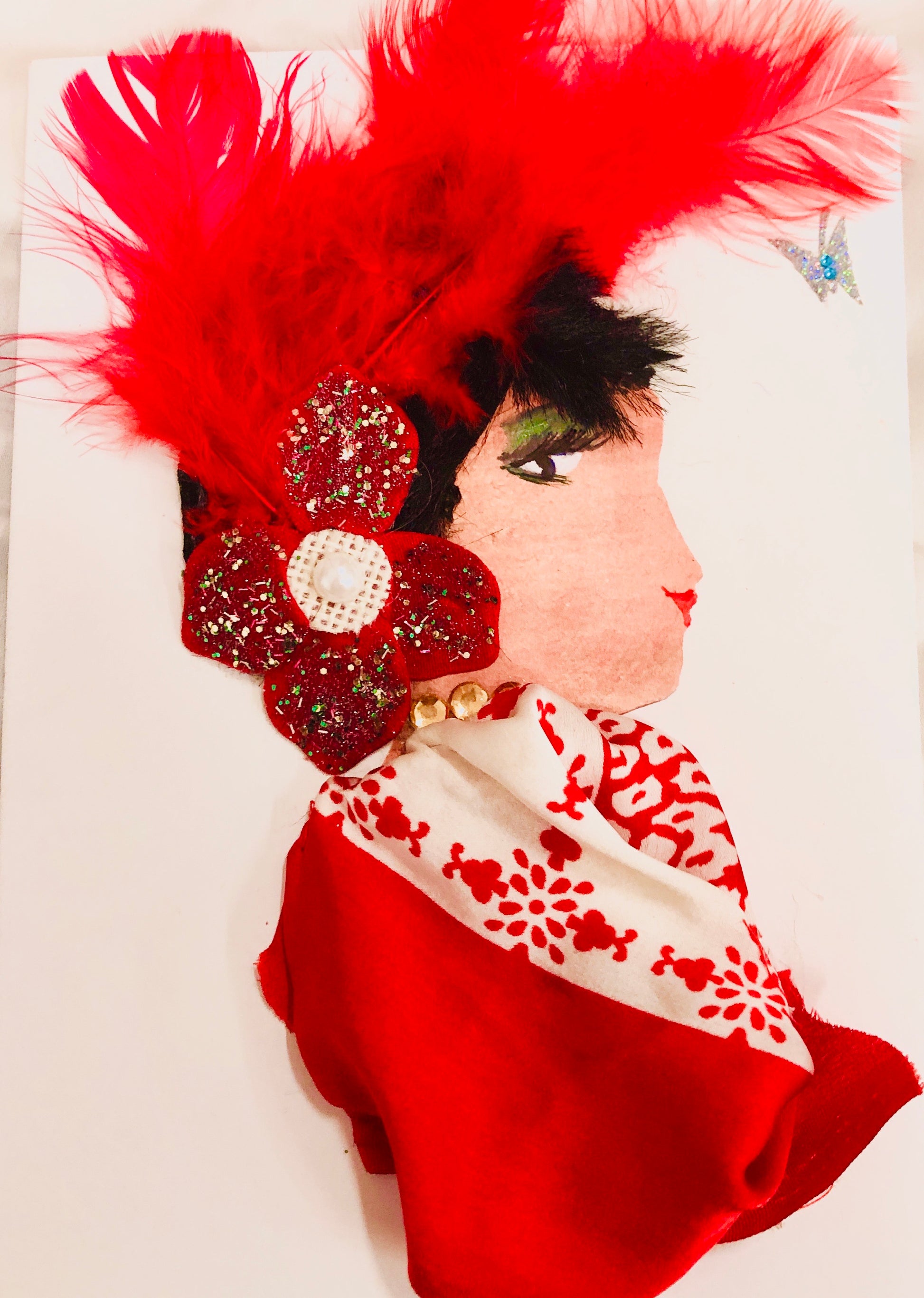 She is wearing a fan-like headpiece in feathery red. She is wearing a very stylish white and red blouse.