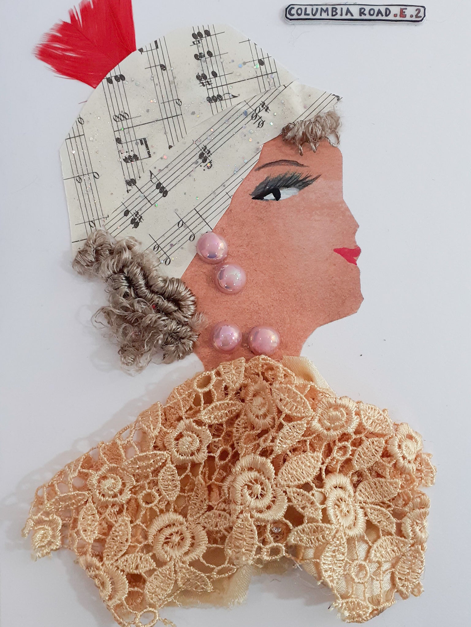 Gospel Hill is wearing a unique golden dress with pink earrings and a fancy, expensive woolly hat with musical notes and a red feather on top. On the top right corner, there is a sign for Columbia Road.