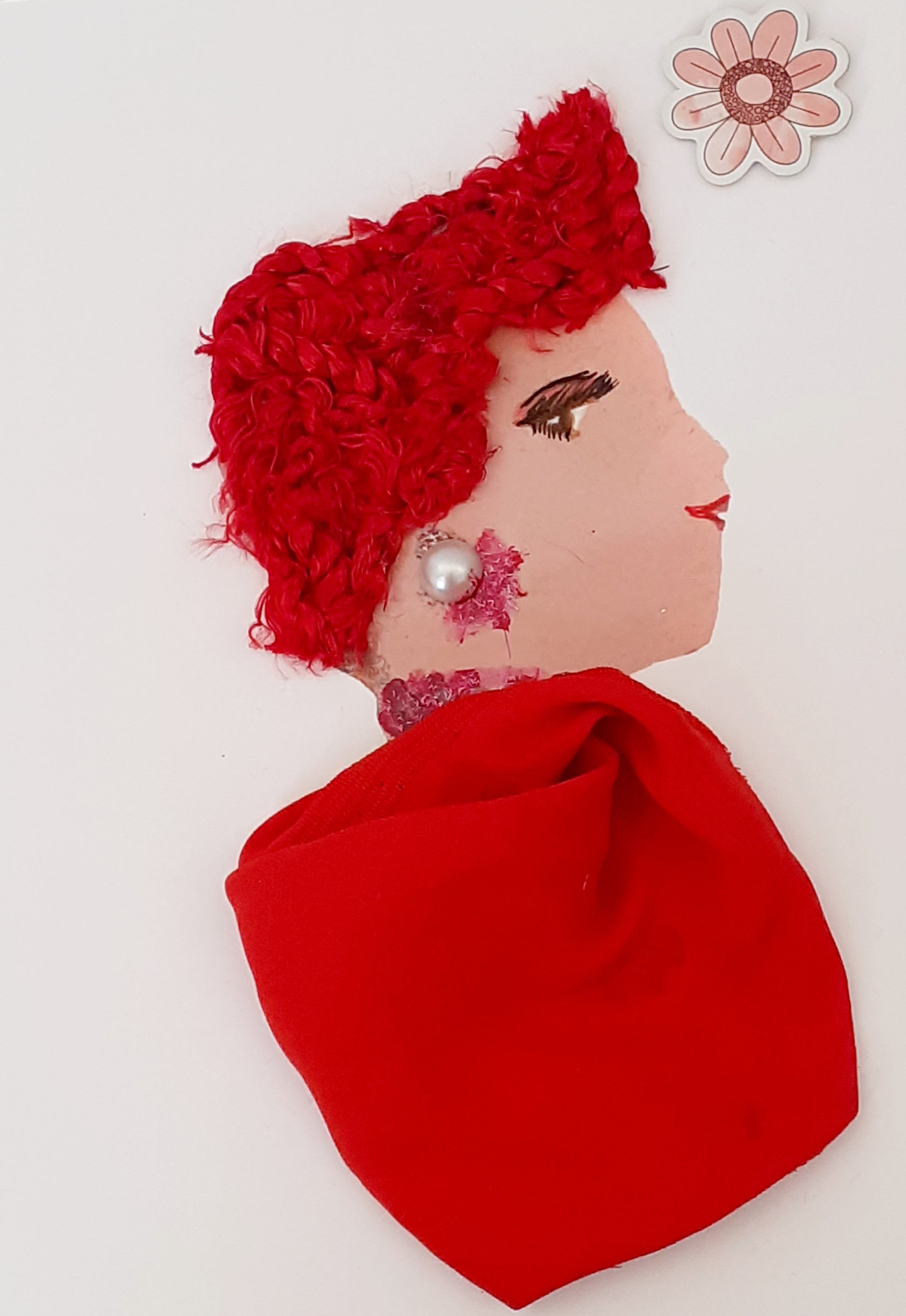 Grace Elm is wearing a bright red blouse with a diamanté earring and has a curly red hair. There is a light pink flower in the top right corner.