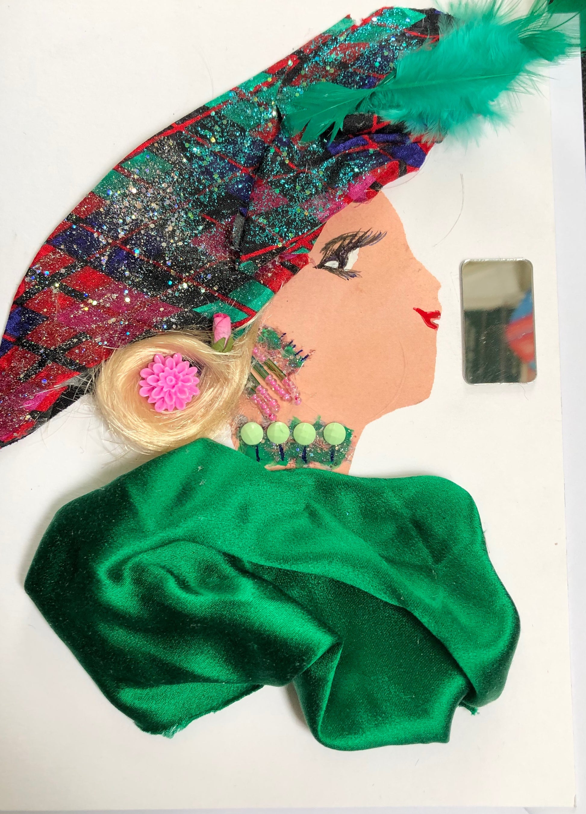 Greenford is wearing her psychedelic hat which has a green feather. She has her hair wound in a pink rose and is wearing a green satin blouse with her light green beads. She has a mirror in front of her.