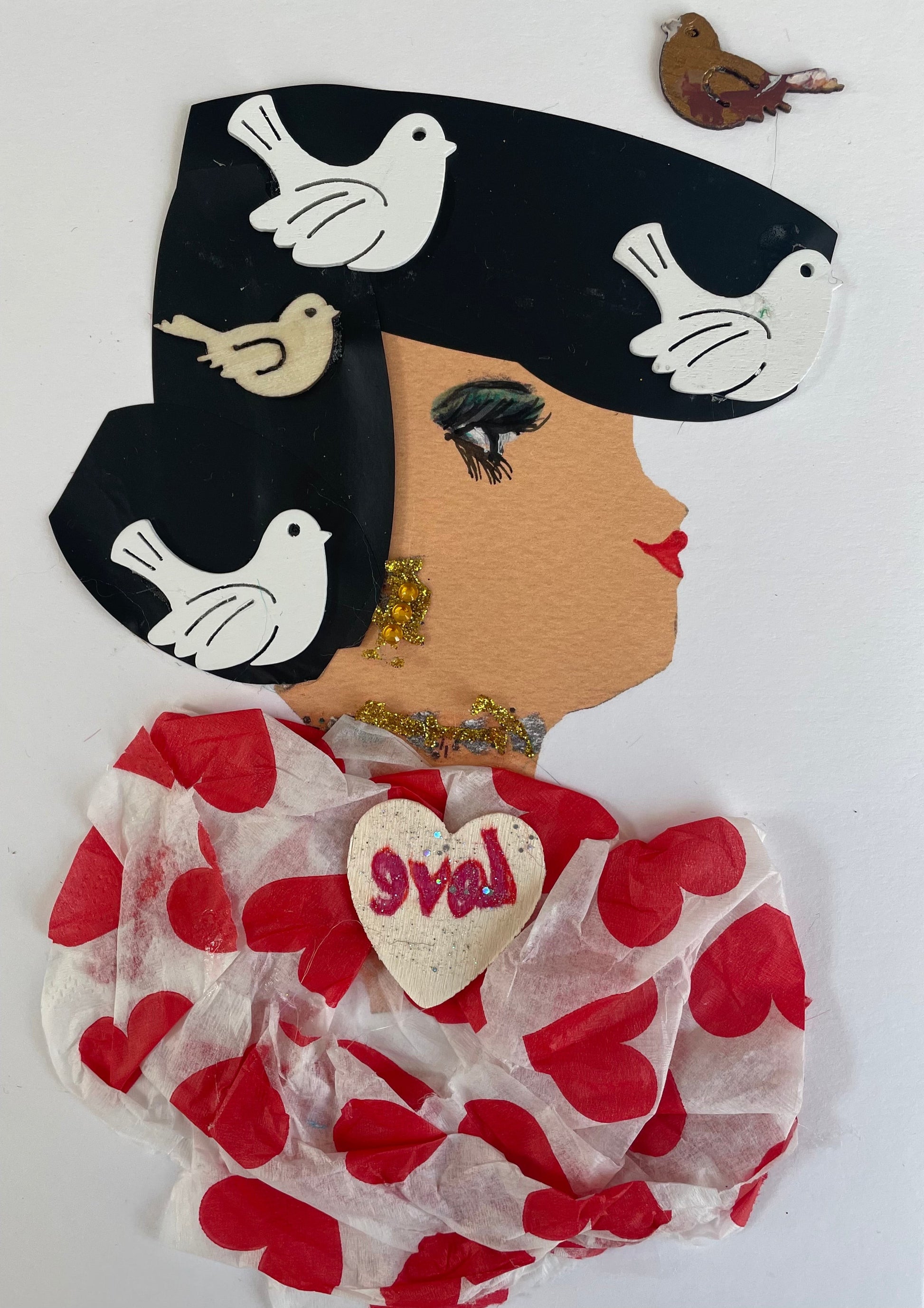 Abi Hearts is wearing a white blouse with red printed hearts all over it. There is a tan jewel on her blouse that says "love". She has matching gold diamanté earrings and necklace. She has a headpiece with 3 white doves and one light brown bird. In the top left corner, there is a brown bird.