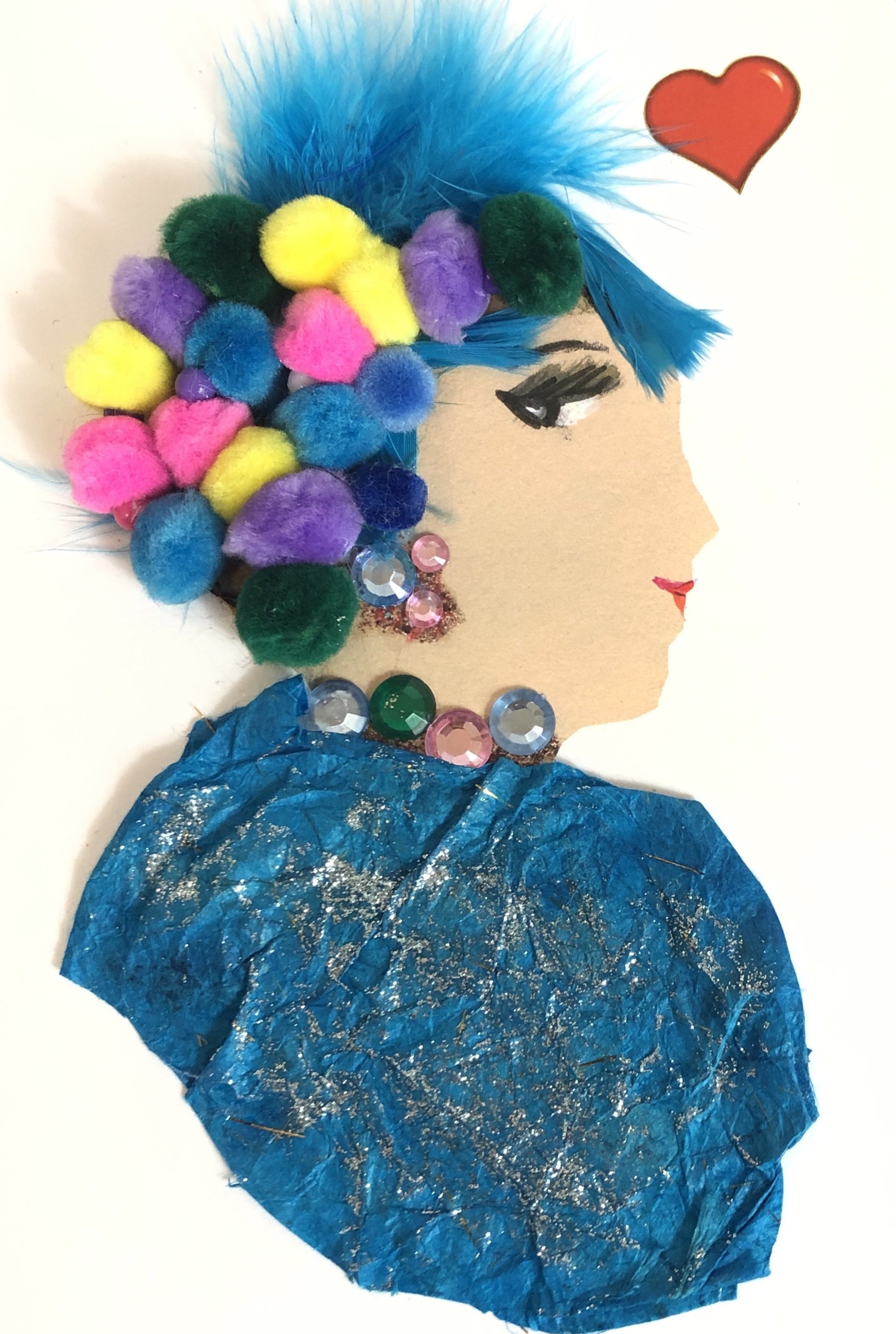 She’s wearing a multi-coloured hat and a turquoise blouse. There is a red heart towards the right-hand side.