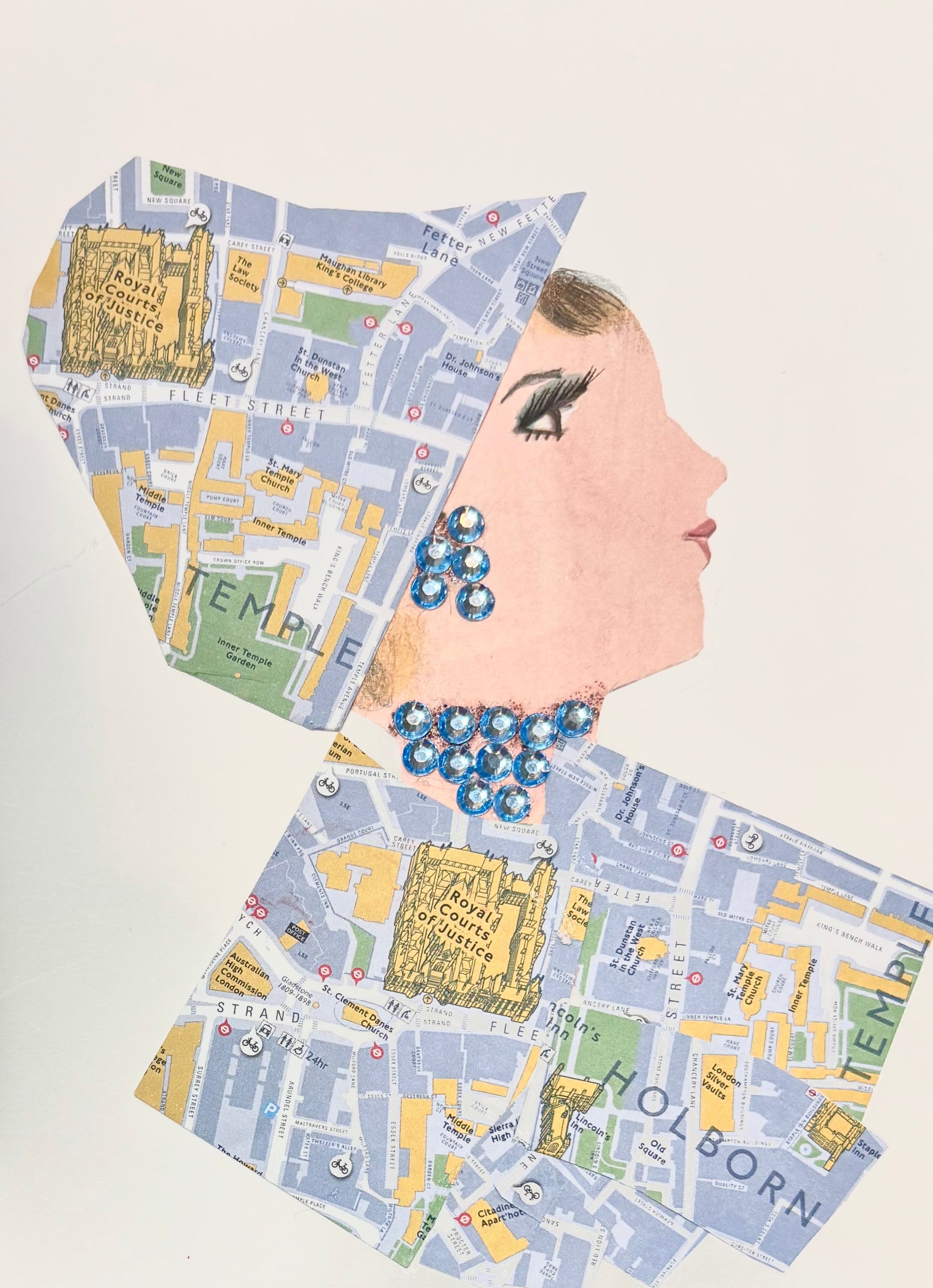 This one of a kind card is handmade with great attention to detail. Holly Holborn wears a map patterned hat and matching blouse. Her blue jewellery complements the blues within the map pattern.