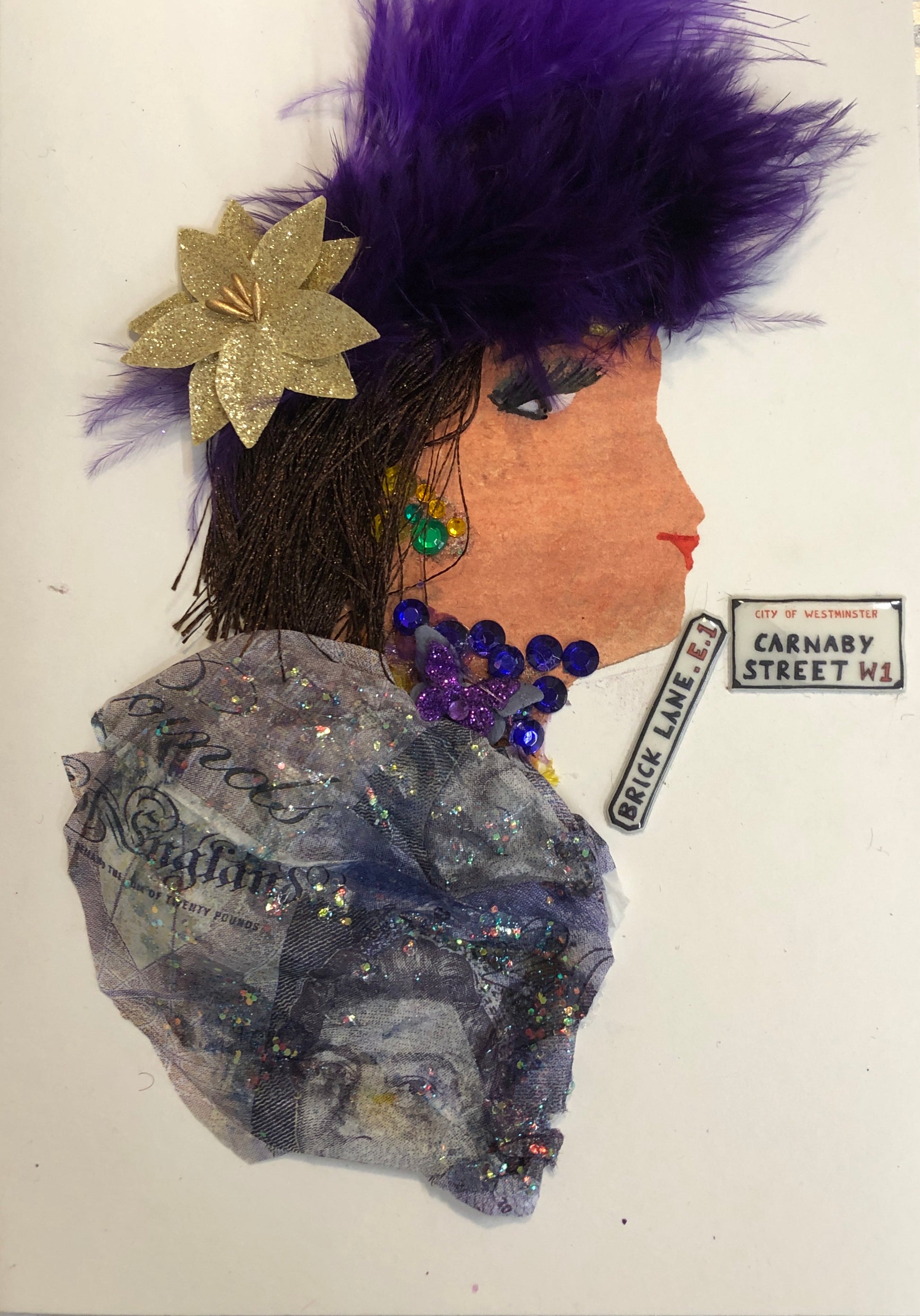 She is wearing a purple fluffy feathered hat with striking brown hair. Her necklace is purple and matches her hair. There is a gold flower in her hair. Doctor Purple also has two signs, Brick Lane and Carnaby Street.