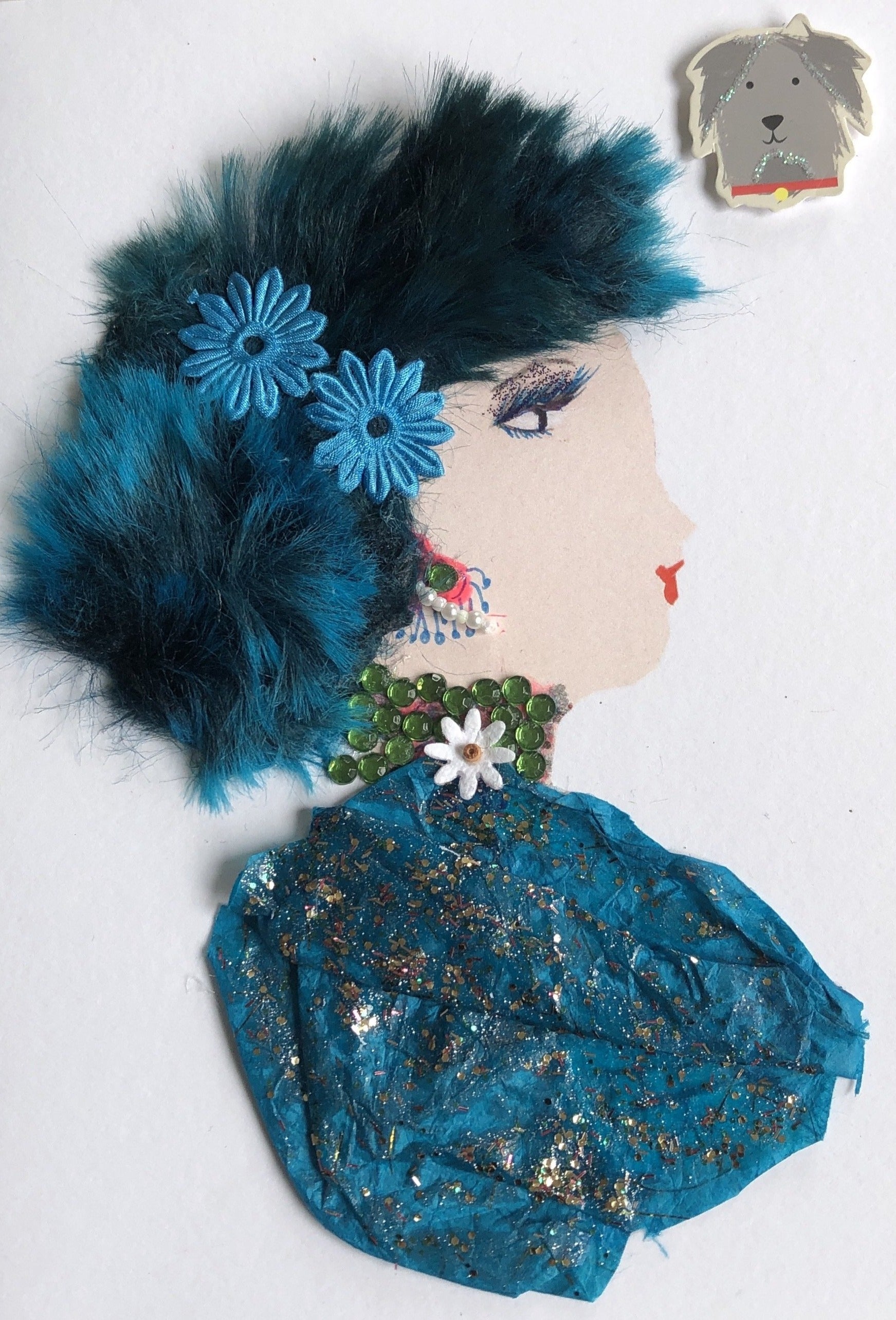 Zsabella Islington is wearing a turquoise blue sparkly top with her emerald green necklace which has a white daisy flower as her pendant. Her hair is a turquoise blue shade In a furry styler. She has two dark flowers in her hair. She is wearing pill earrings. There is a grey dog sticker in the top right.