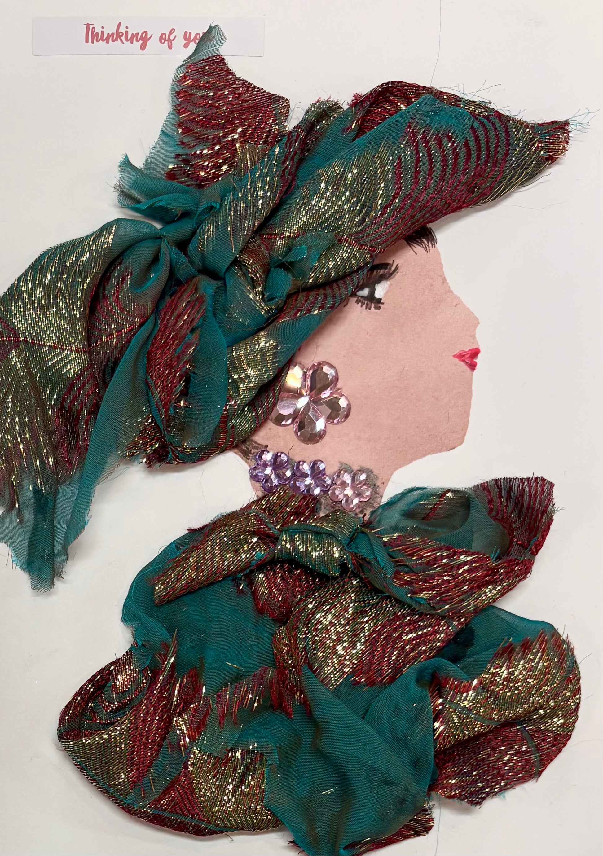 This one of a kind card features a woman wearing a matching jade green hat and blouse with red and gold accents. Her bright jewellery rounds out her outfit perfectly. Give this unique card to someone you are thinking of.