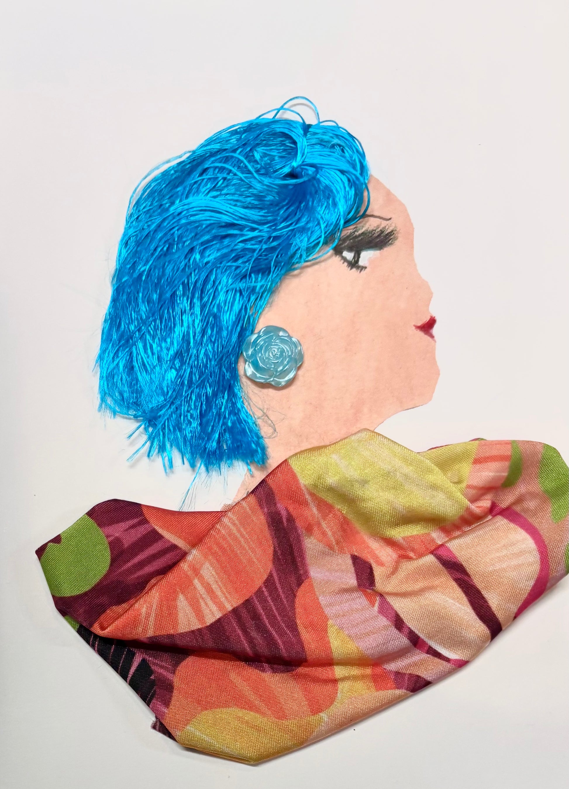 This one of a kind card is perfect to give to someone you love. Jazzy Julia rocks bright blue hair and a multicoloured top featuring warm tones.