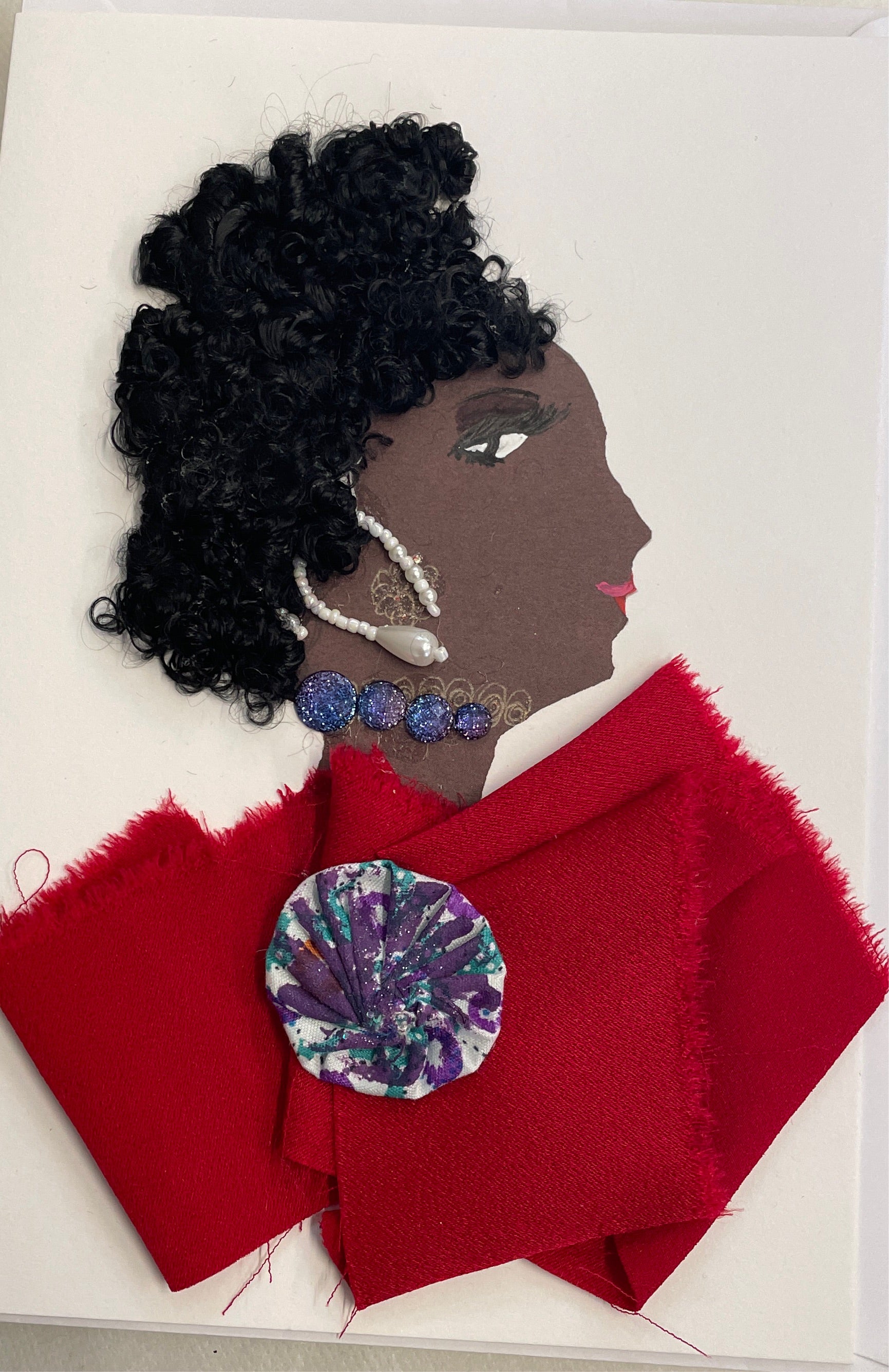 This card is Called Harriet 31. I have designed her wearing a red blouse with jewellery end big curricular bow. She has with dangling earrings and purple beady type necklace.