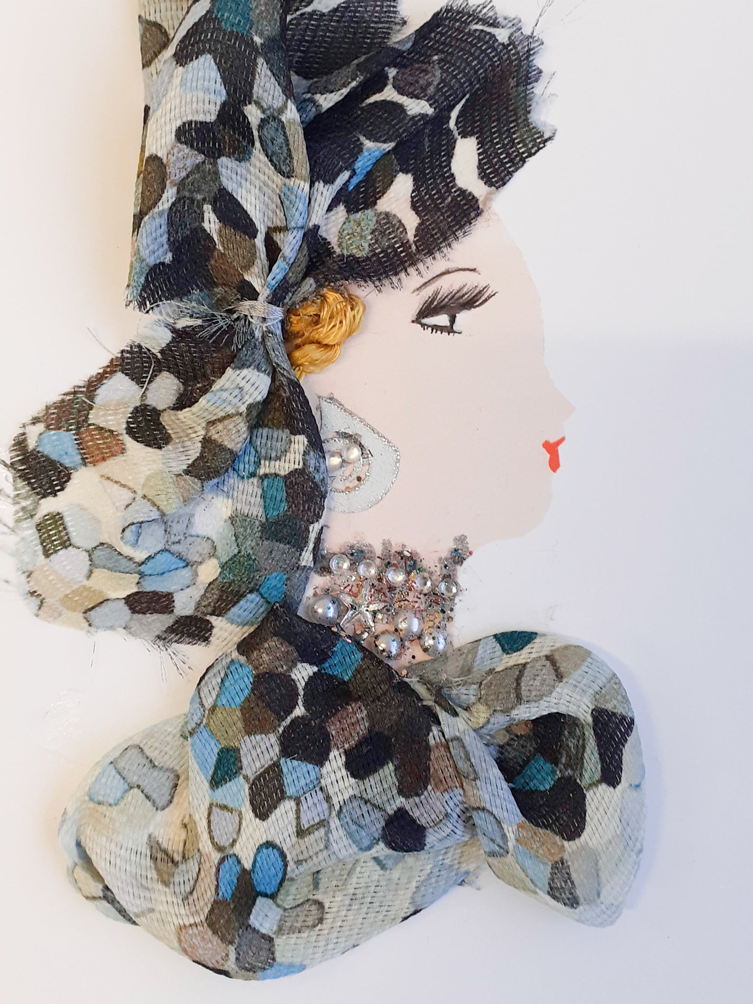 Khelsea Cyprus is wearing a multi-coloured blouse that has silver, blue, and pearl shapes.