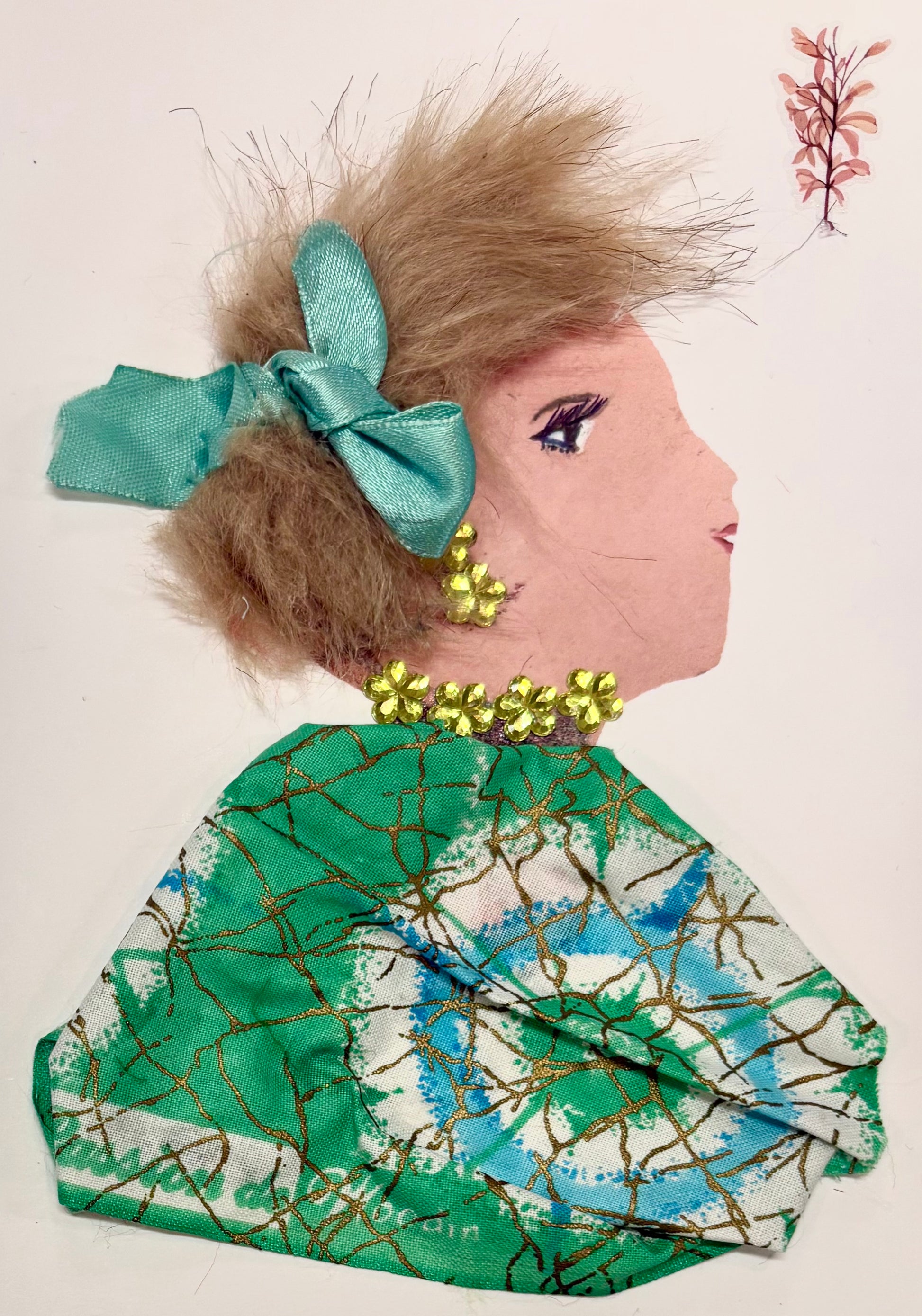 This one of a kind card is perfect to give to someone you love. The woman on the card wears a bright green bow and a multicoloured blouse. Her green jewellery complements her whole outfit.