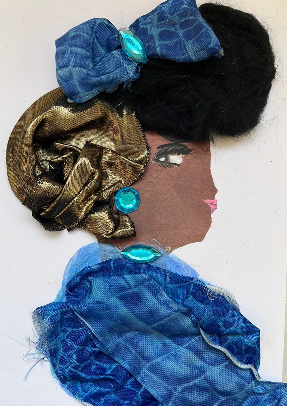 Anya wears a blue animal print blouse with a matching bow. In her hair, she has a bronze silk scarf.