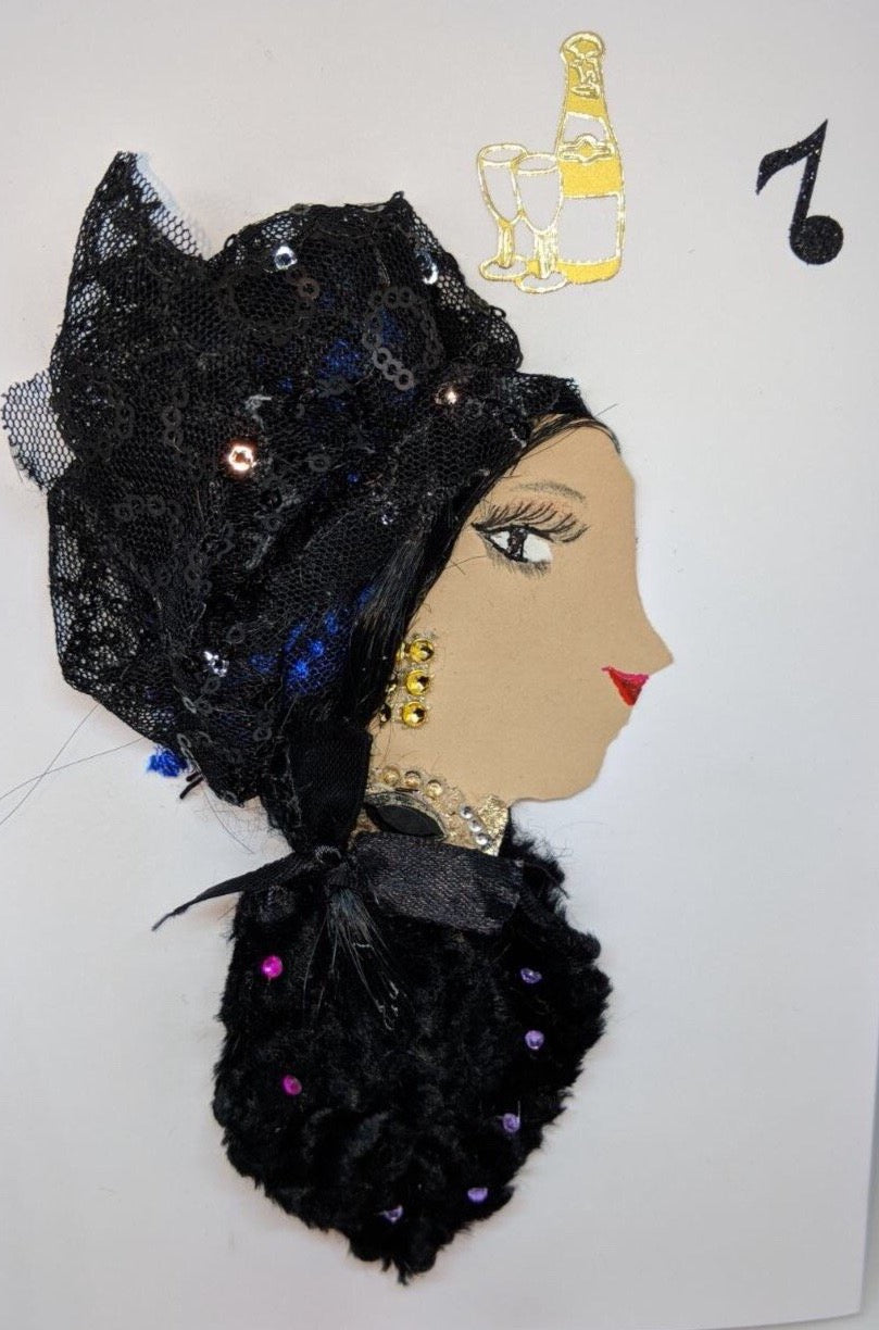 Katie is adorned in a beautiful black headdress that is sequined. There is a gold bottle and black note on the right side.