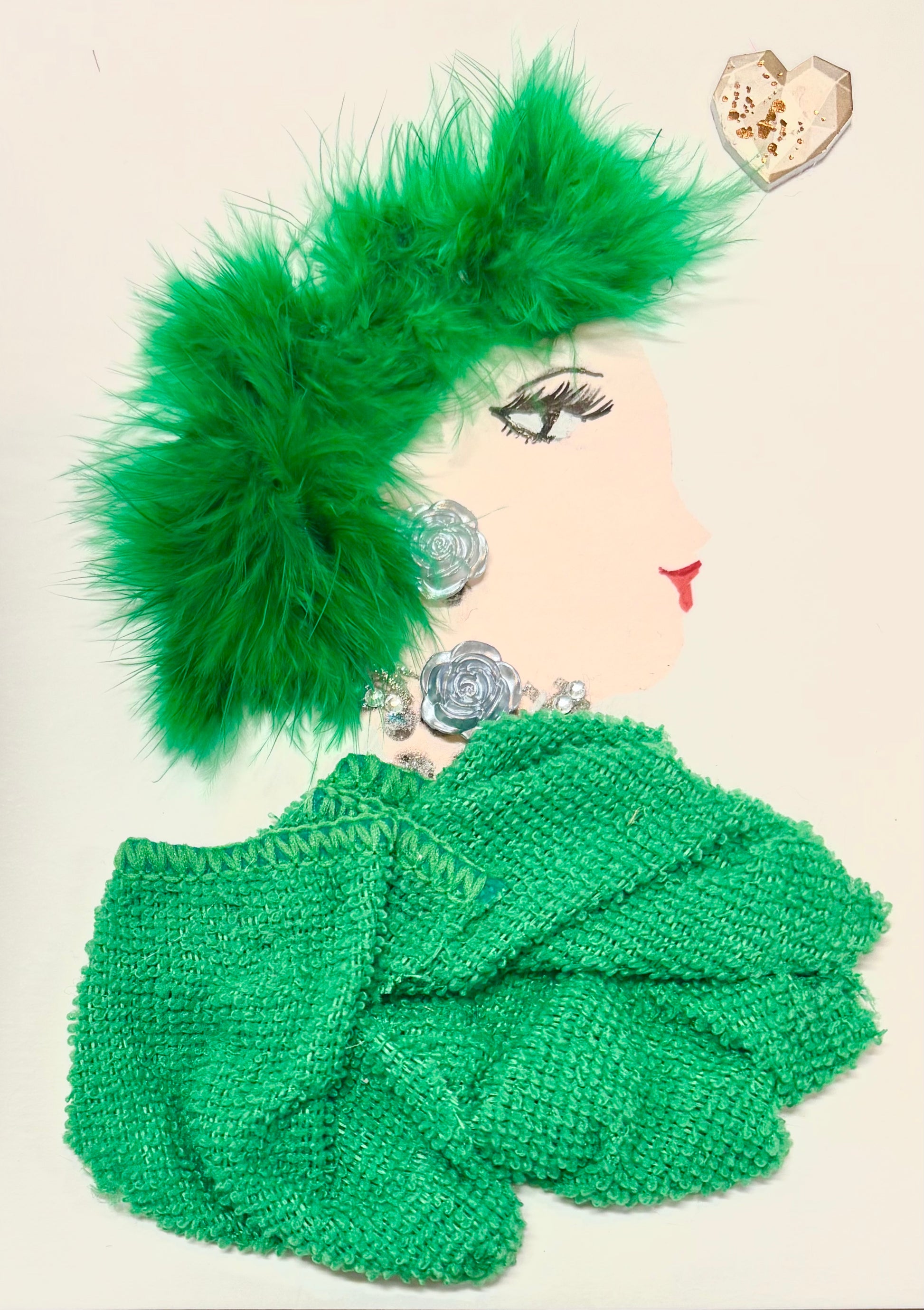This bright green card will brighten anyones day! Lady Meadow has bright green hair and a blouse that matches. Her silver jewellery resembles roses that can be found in a meadow.