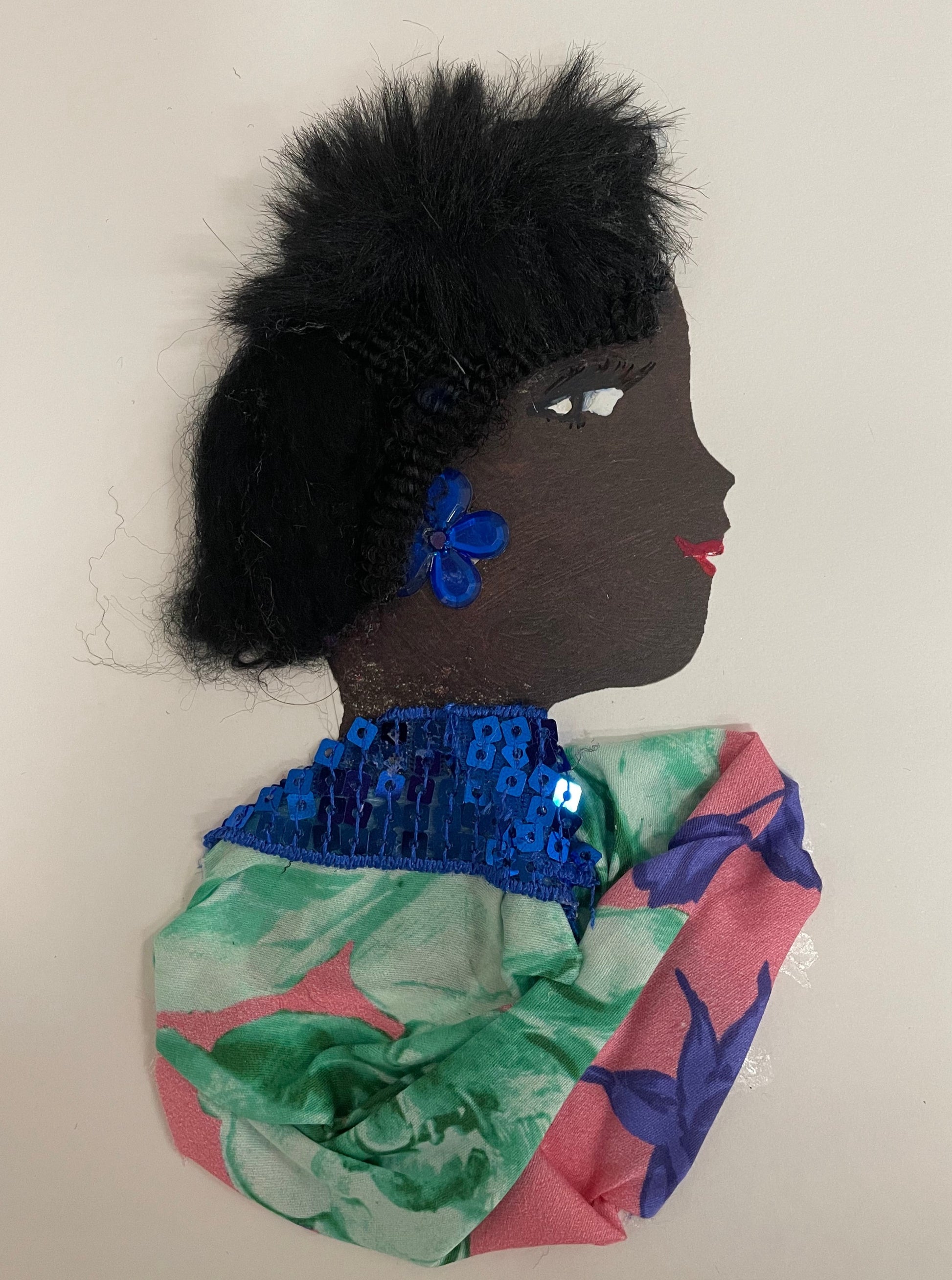 Doctor Rachel is wearing a pink, green and blue floral patterned blouse. She has a royal blue sequenced necklace with the same coloured flower earrings.