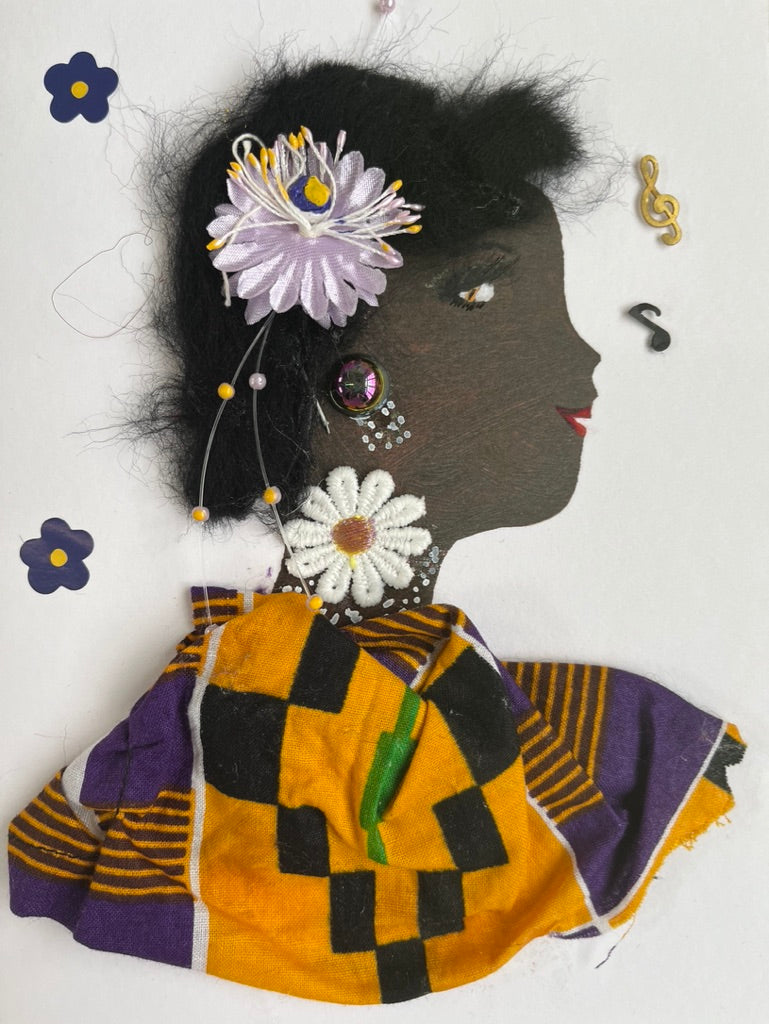 Gemma wears a purple and yellow patterned dress with a matching purple flower in her hair