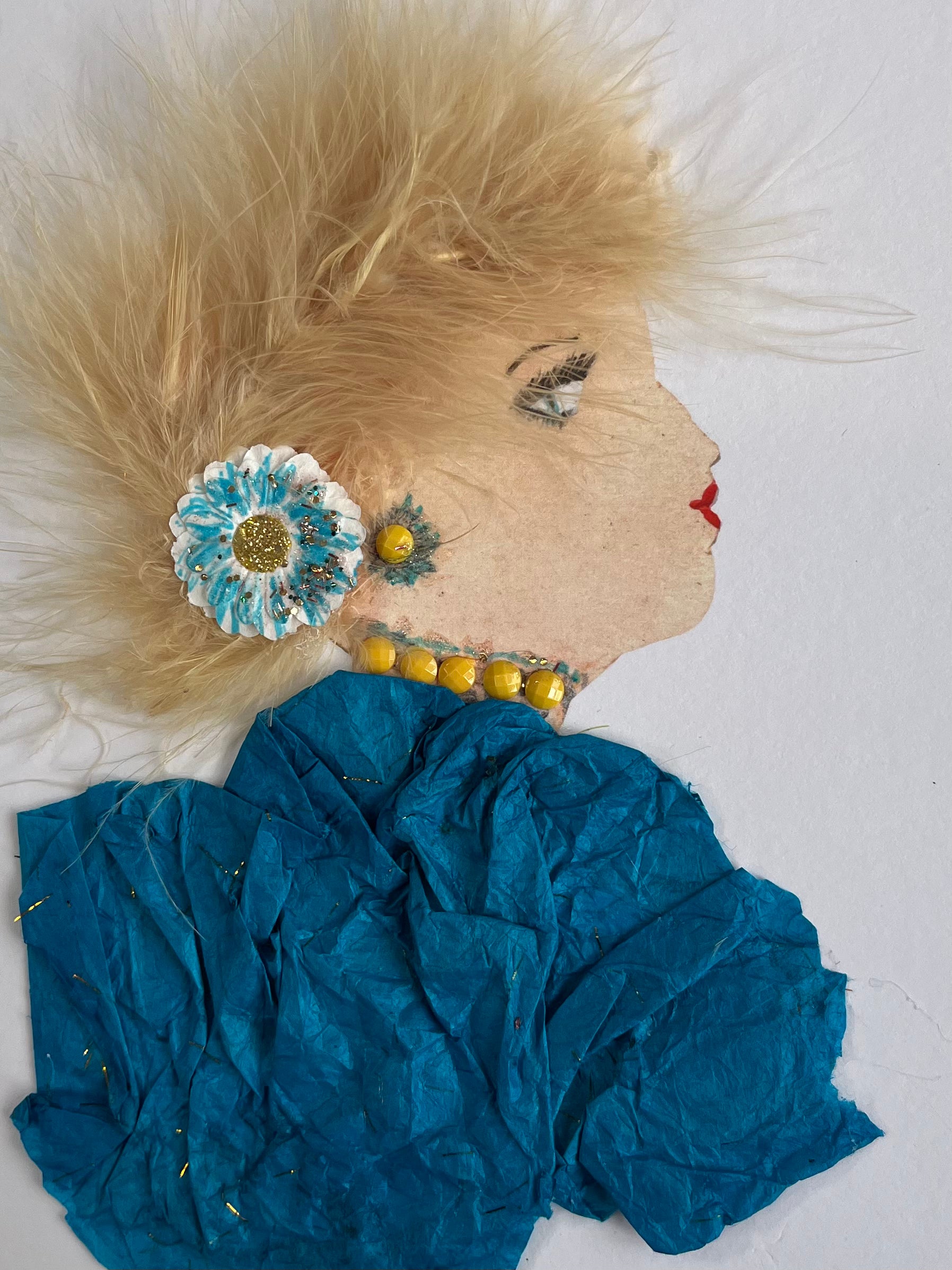 Offred wears a blue flower in her striking blonde hair and a blue chiffon dress. Her jewellery accents her outfit with bold yellow gems and blue accents.