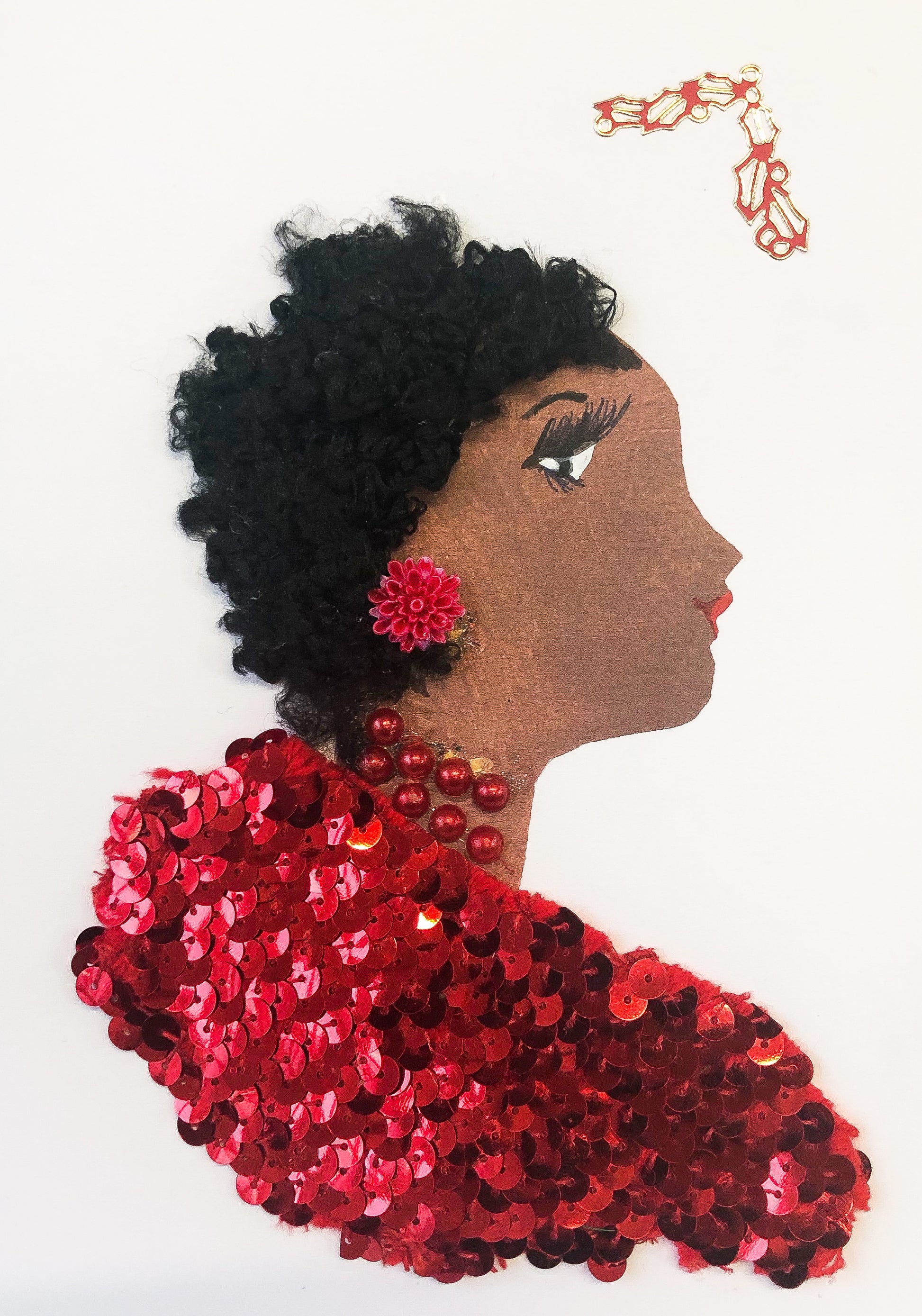 A woman wearing festive red sequined clothes who also has black curly hair. A red earring matches her attire with holy leave stickers to the top right of her head.