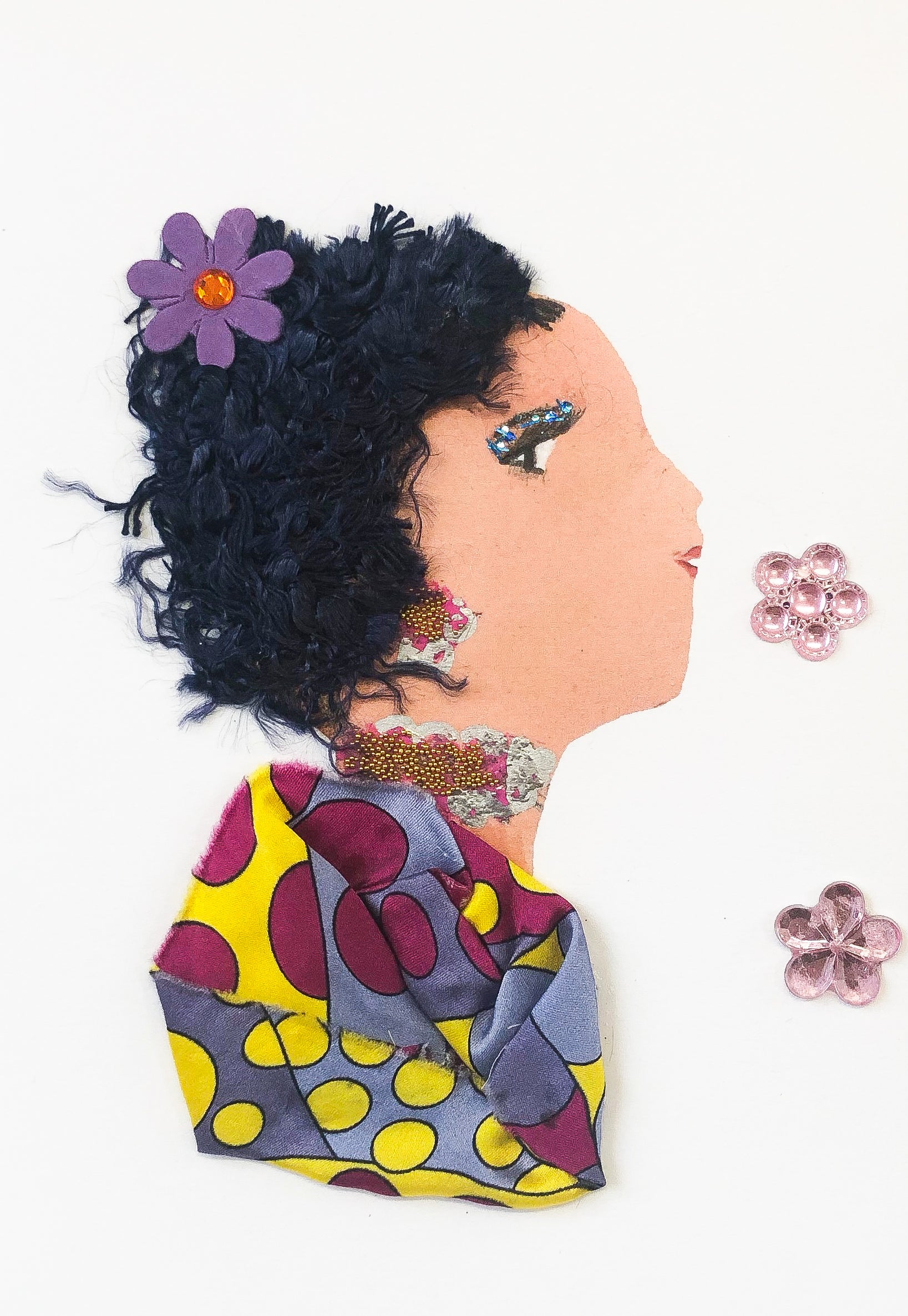 Lydia London is wearing a butter yellow and mauve polka dot blouse. She has dark blue messy hair with a purple flower attached to the top. Her jewellery consist of small beads. There are two pink flowers in front of her in this picture