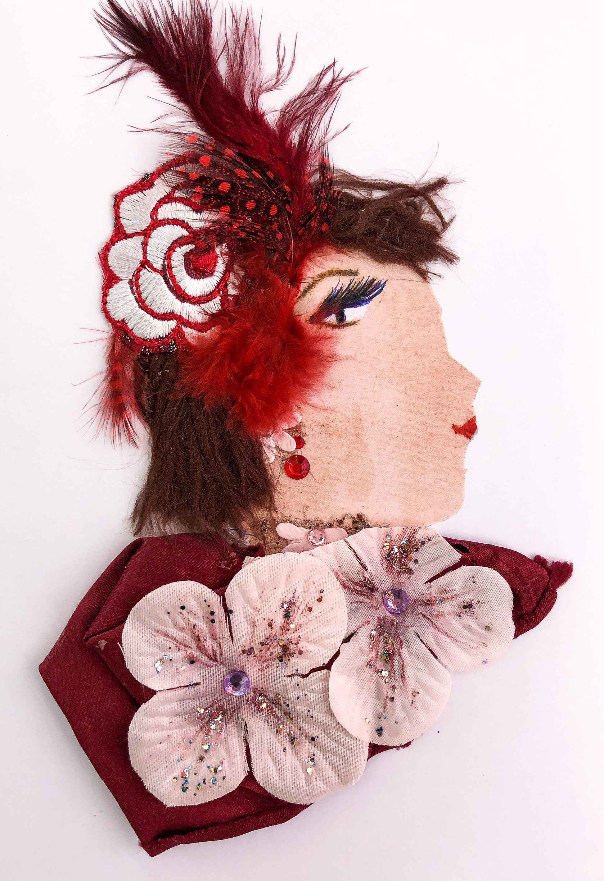 She wears a red top with white flowers on it. In her hair, she has a red headpiece with flowers and feathers.