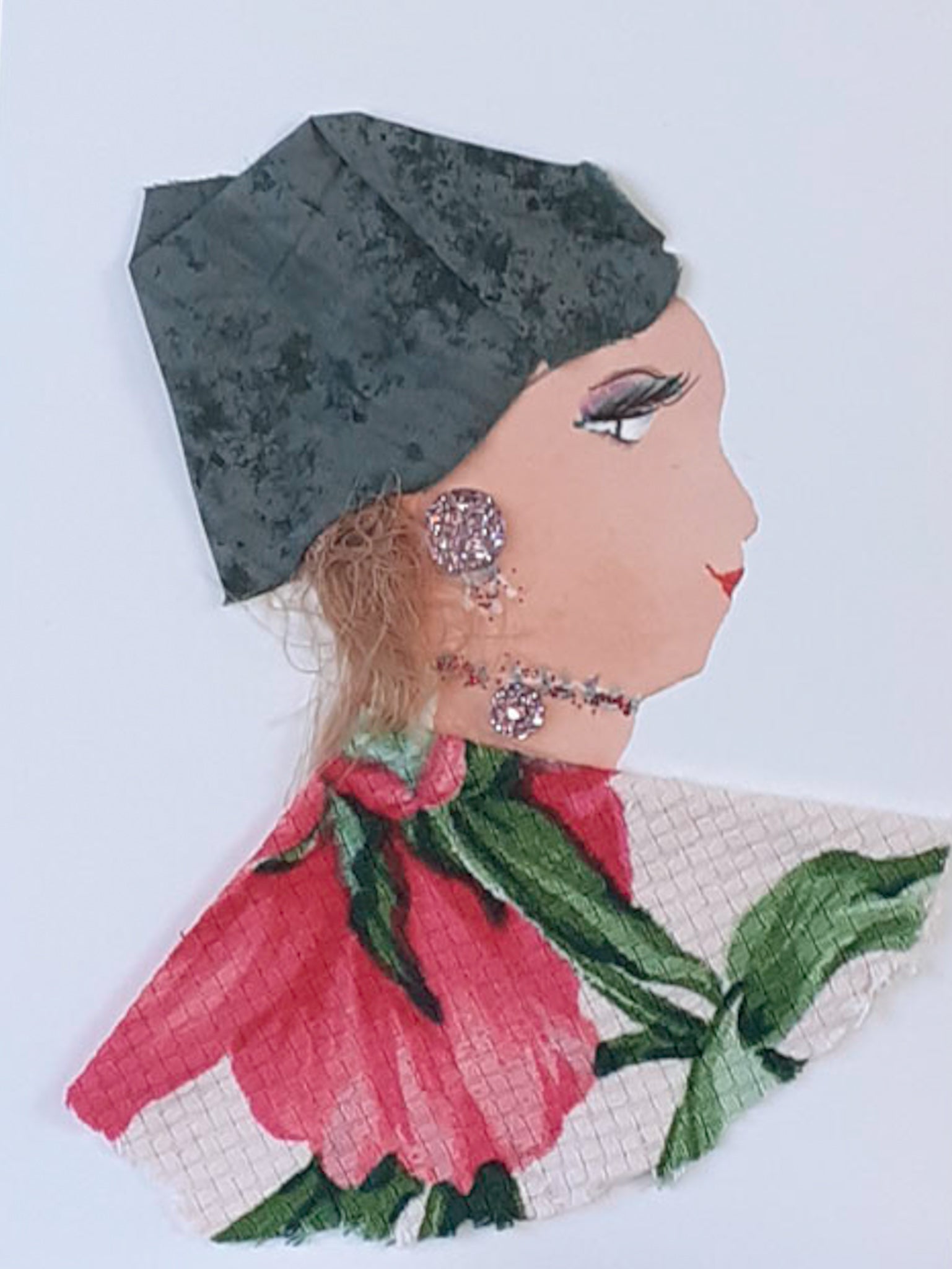 She wears a floral printed blouse with a gray headpiece. There are tufts of dirty blonde hair coming out from under her headpiece.