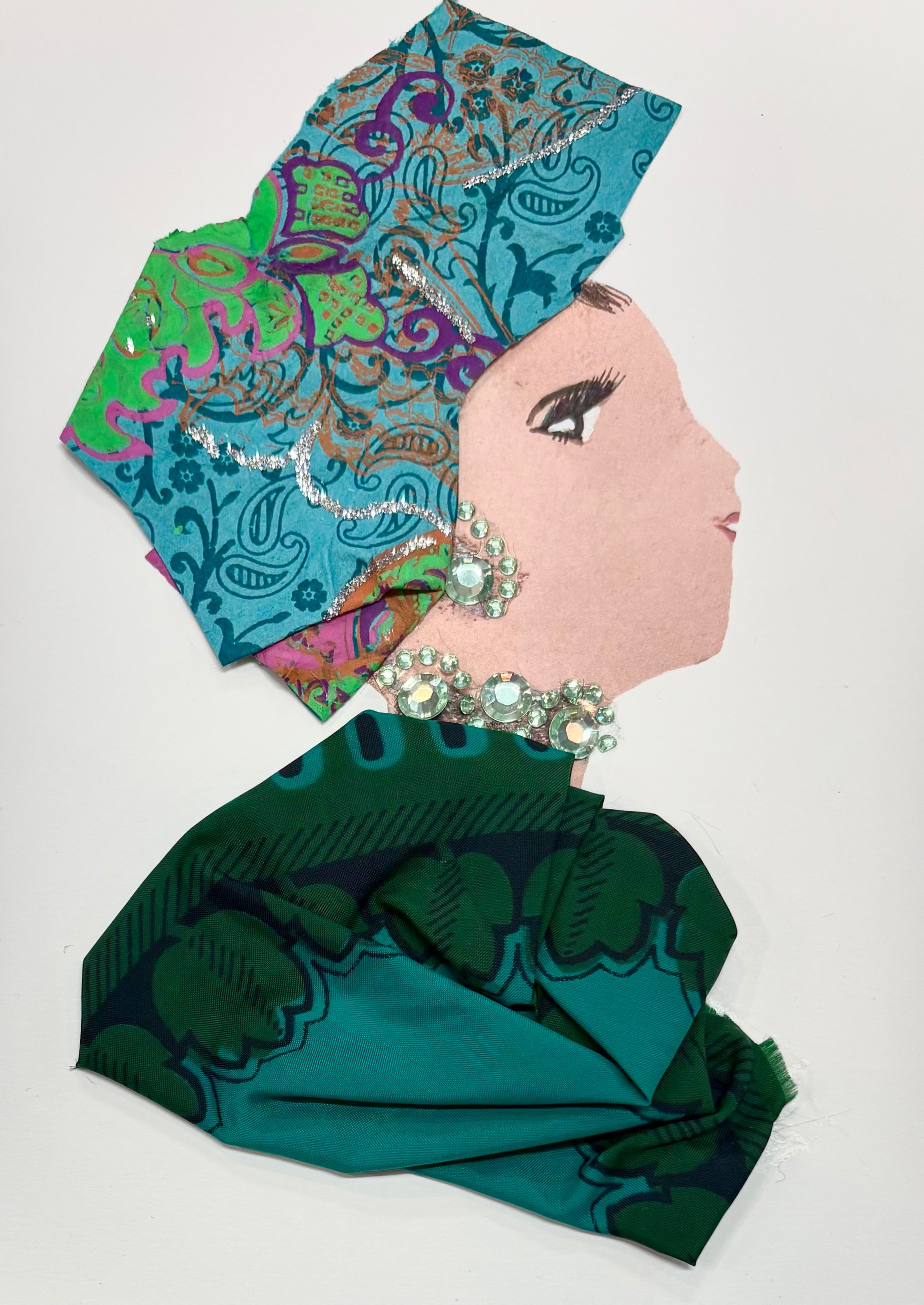This beautiful handmade card was crafted with care. Marvelous Maureen wears a teal and green headwrap with an emerald green blouse. Her pale green jewellery complements her outfit perfectly!