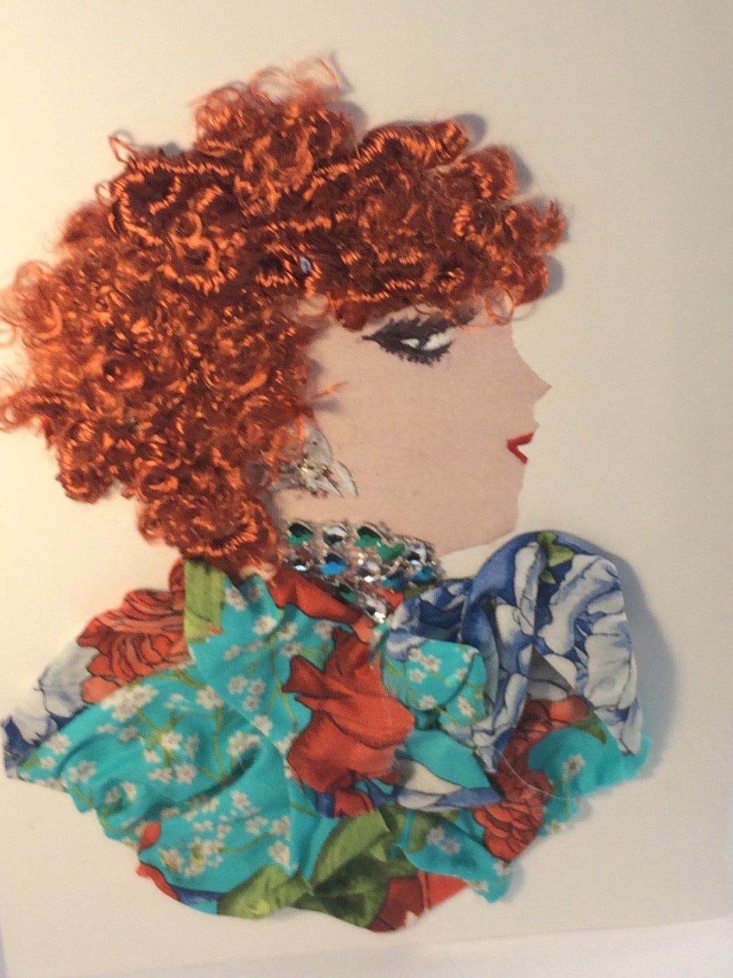 Zetty Zushey is wearing a multi-coloured blouse with crazy curly orange hair.