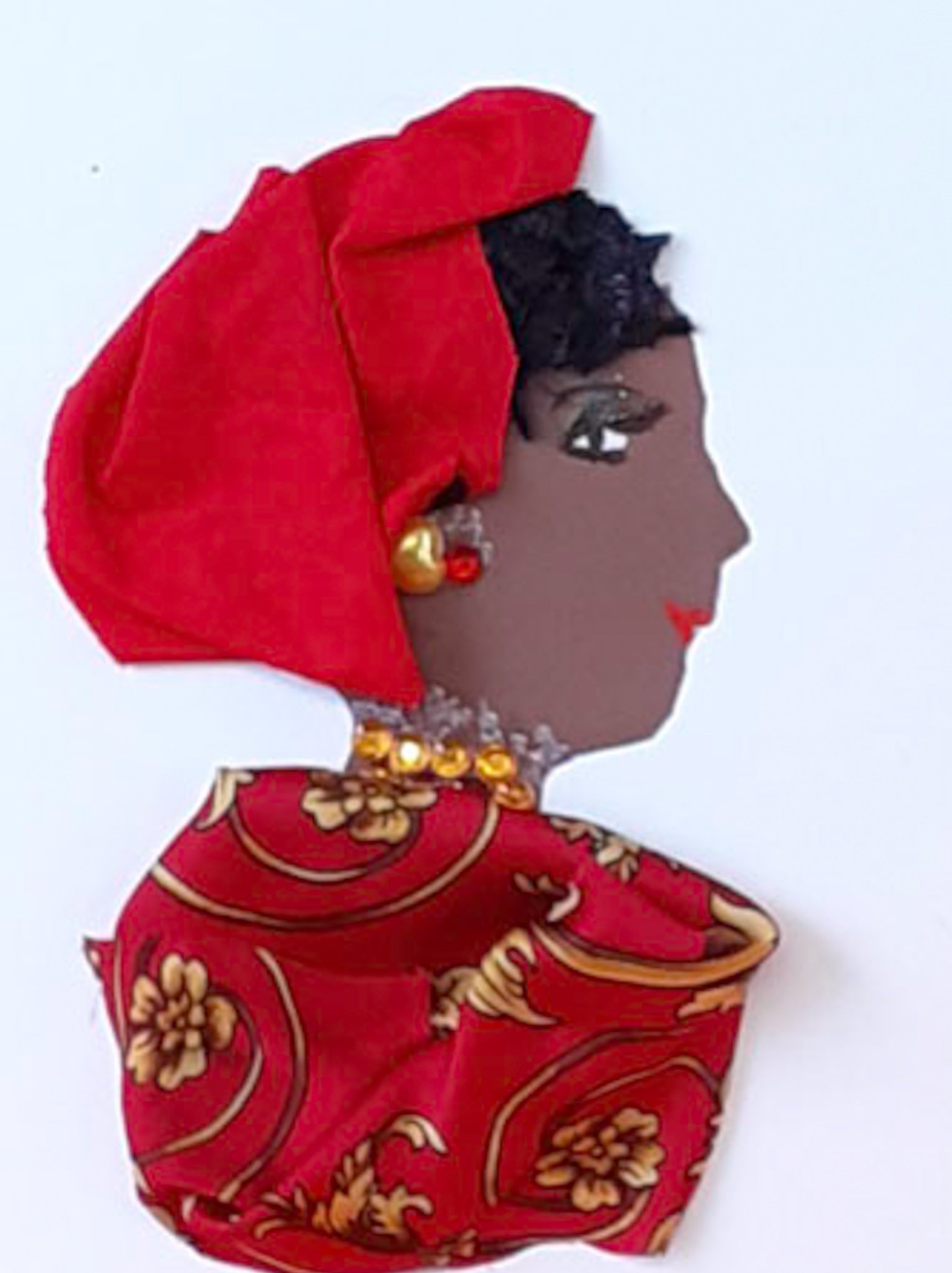Red and wine coloured blouse and headpiece match her beautiful gold jewelry.