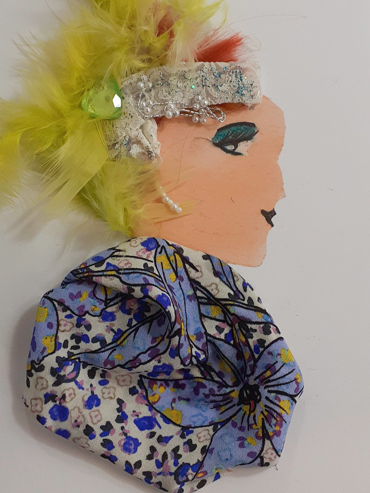 Polly Nottingham is wearing a multi-coloured patterned dress with a diamond headband and has feathery reddish hair tucked behind behind her feathery hat