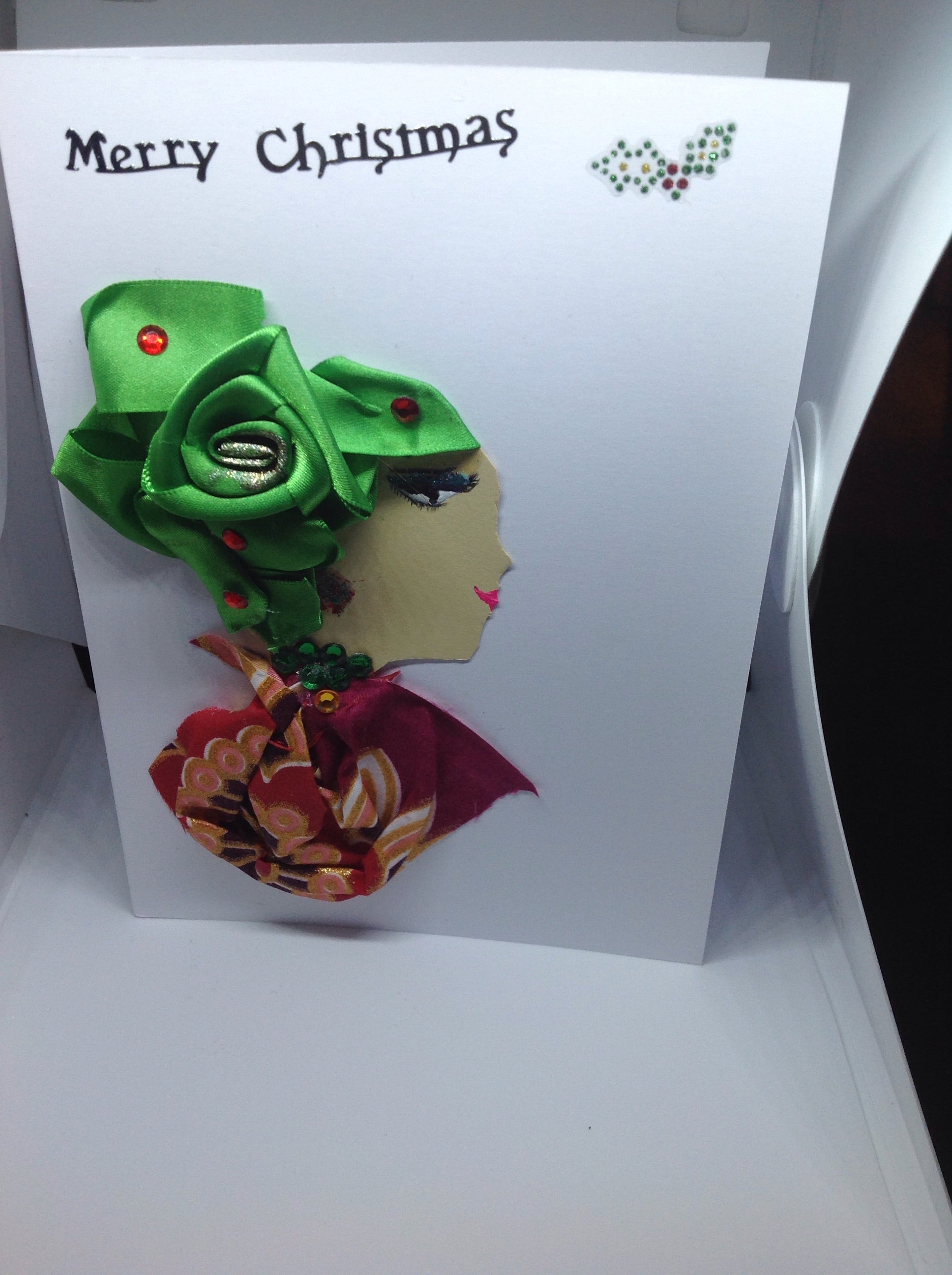 She is wearing a flowered multi-coloured red and pink printed top with a green headpiece. On her headpiece, there are red jewels. At the top of the card, it says "Merry Christmas" and a holly leaf is to the right of that.