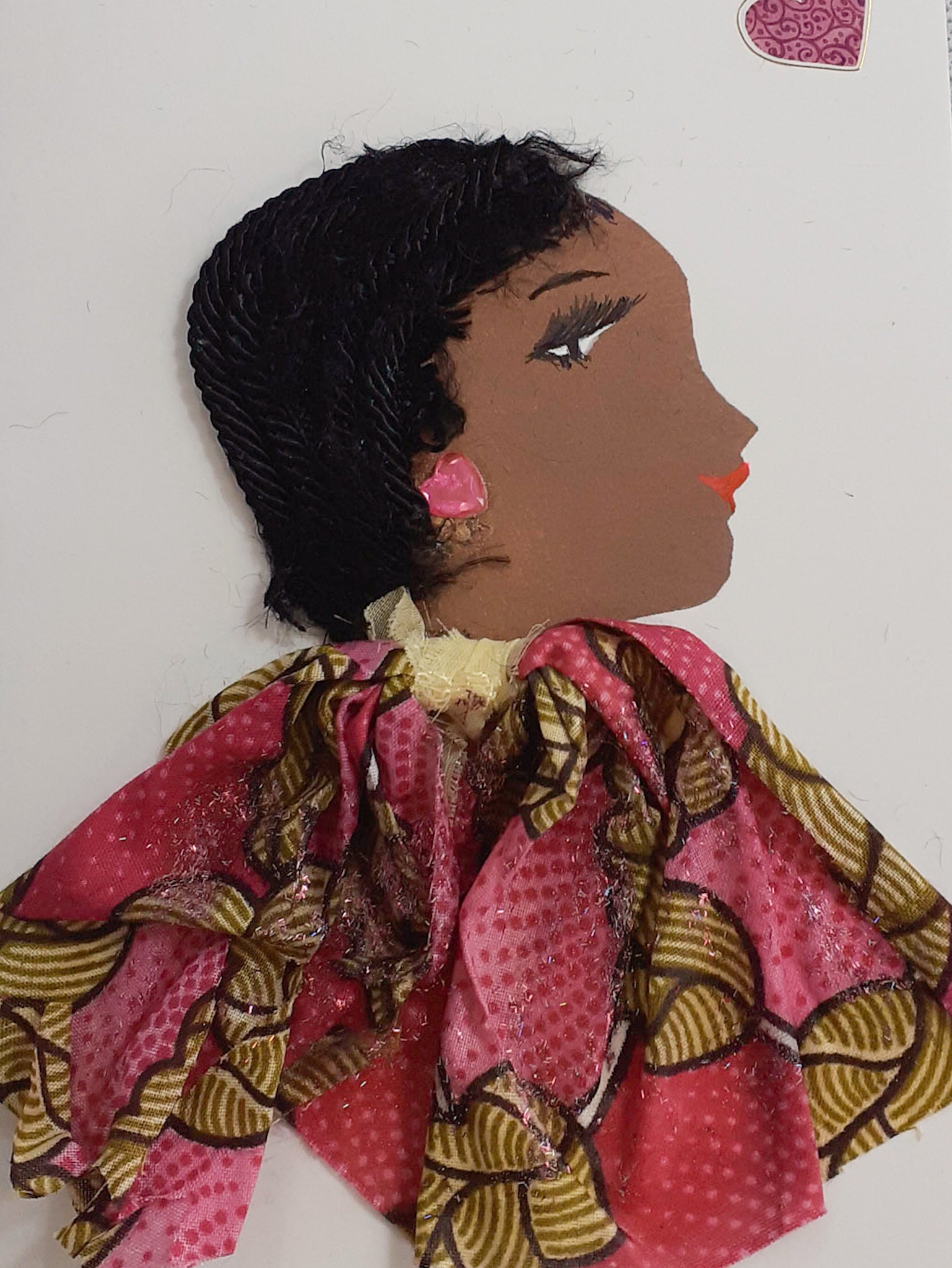 Miss Epping Fairlop is wearing a pink multi-coloured patterned dress with a pink sapphire earring and has soft curly black hair. There is a pink heart at the top right corner.