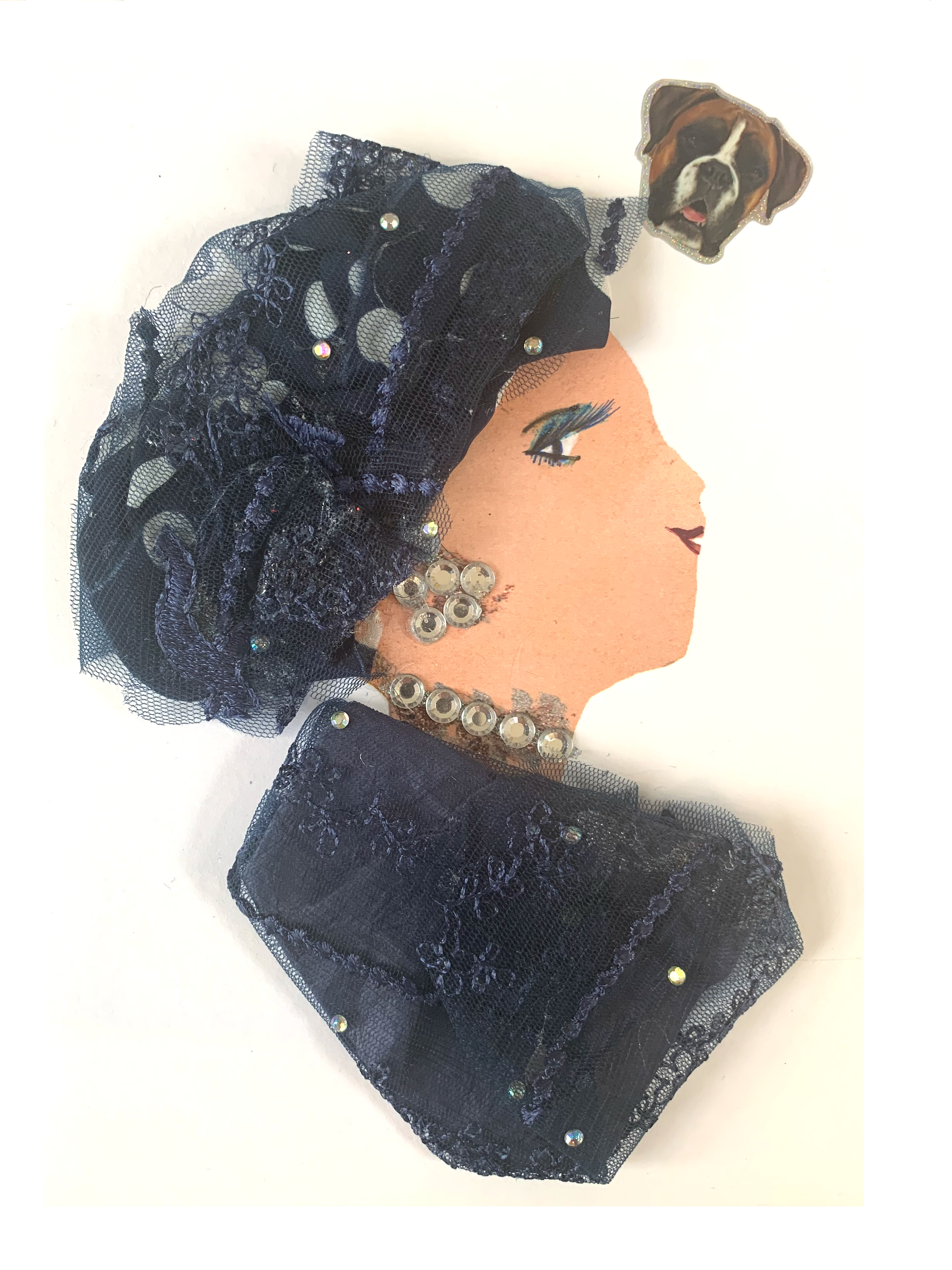 This card is showing a stunning woman who is dressed in all navy. She is wearing a navy top with embellishments and a matching hairpiece. She has big crystal earrings on and blue eyeshadow. Her precious St. Bernard puppy is right there next to her.