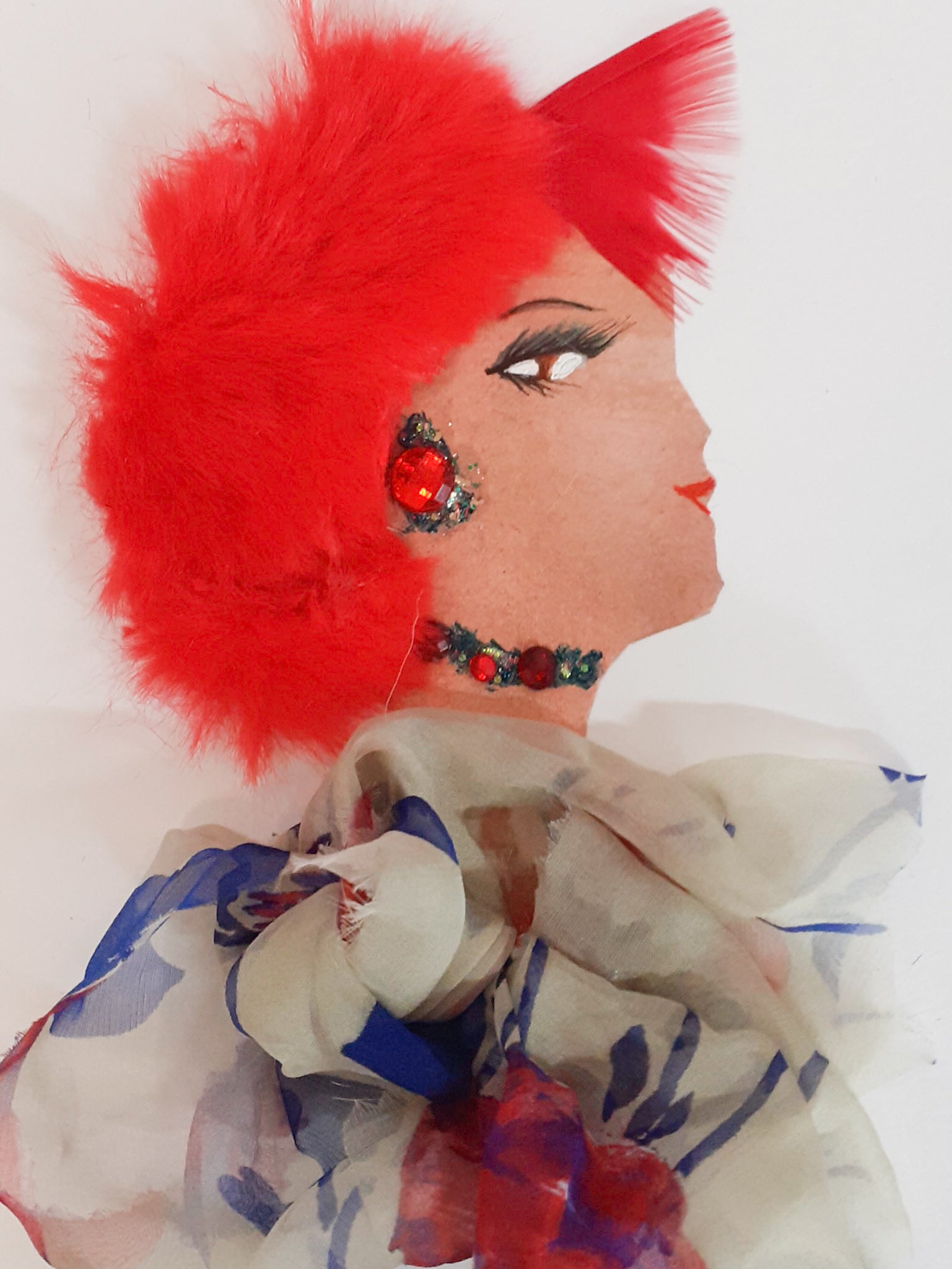 Daisy Hill is wearing a colour patterned dress with ruby earrings and a necklace. She also has red fluffy with a red feather.